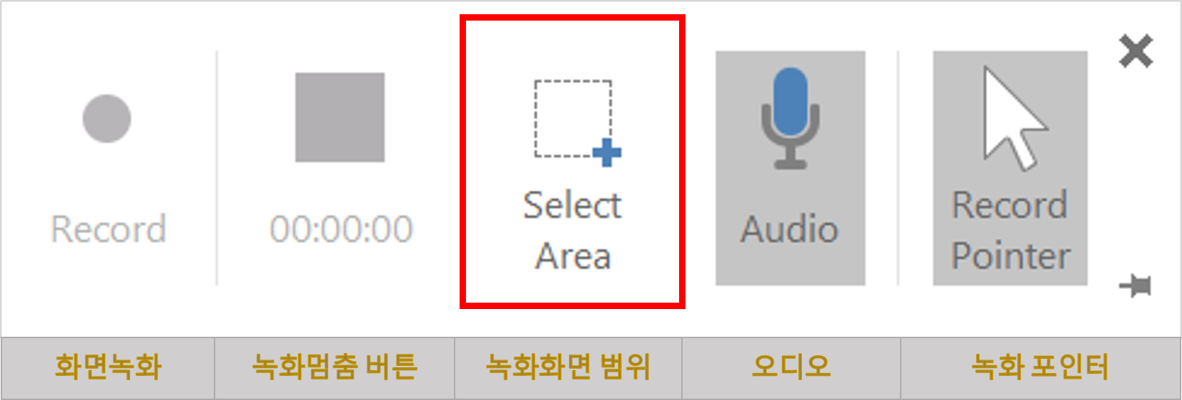 3. 화면 녹화 / Screen Recording을 클릭하면 아래와 같이 화면 녹화하는데 주요 기능이 모여있는 박스가 팝업 됩니다. 중간에 있는 화면 설정 / Select Area를 클릭하여 녹화하고자 하는 화면 비율에 맞춥니다.