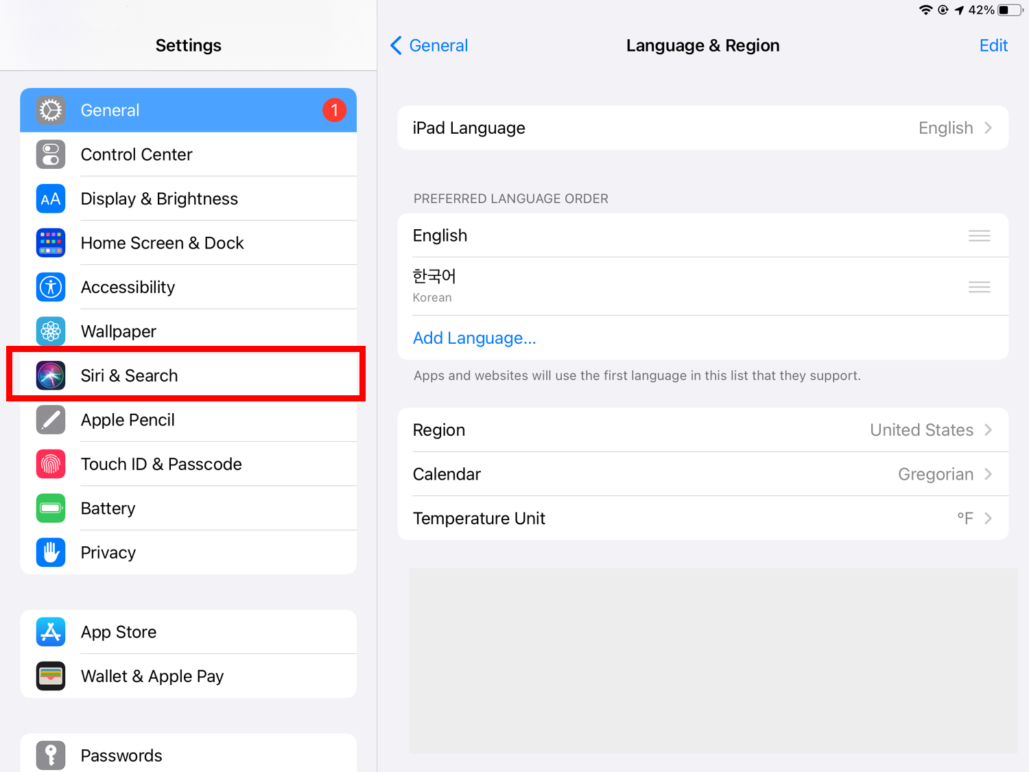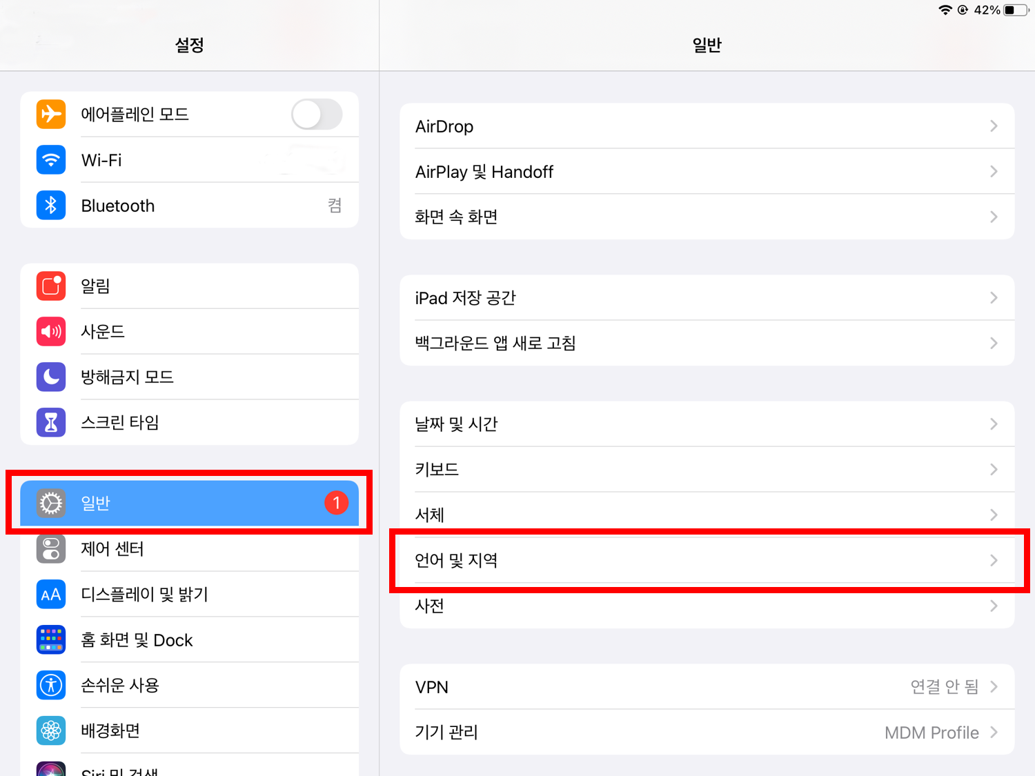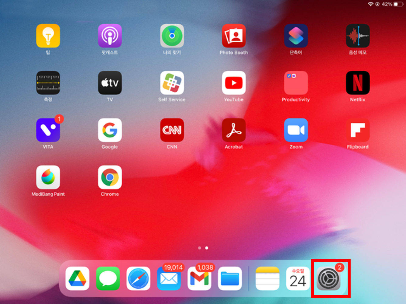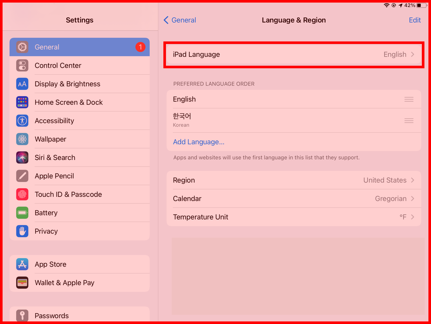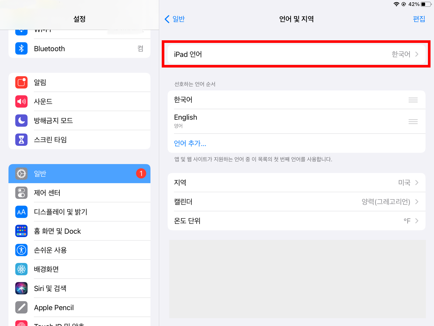 3. 아래 사진의 붉은색 박스와 같이 현재 제 아이패드의 언어 설정이 한국어로 되어있는 것을 확인할 수 있습니다.