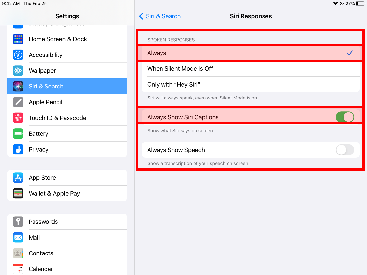 4. Siri Response에 시리의 Spoken Responses(음성 응답)을 Always(항상 켬)으로 해줍니다.