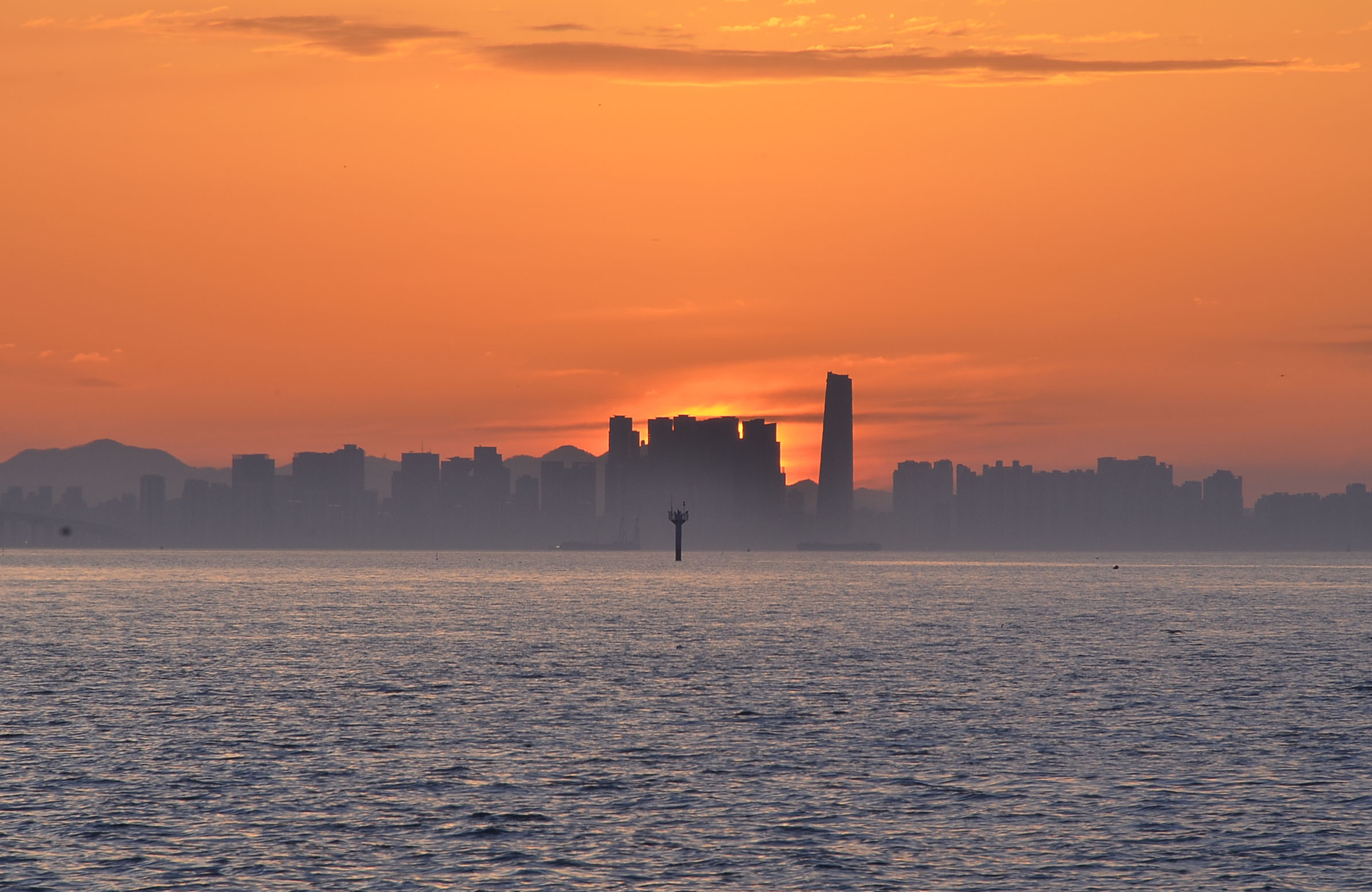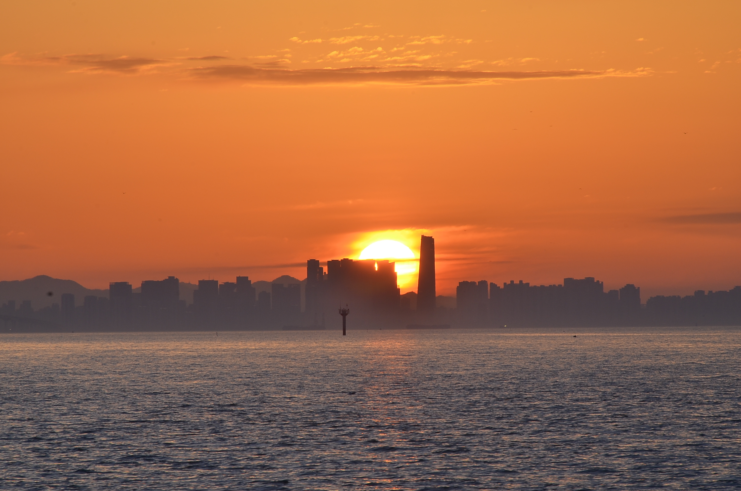 ▼ 인천 송도신도시의 높은 건물 사이로 솟아오르는 해