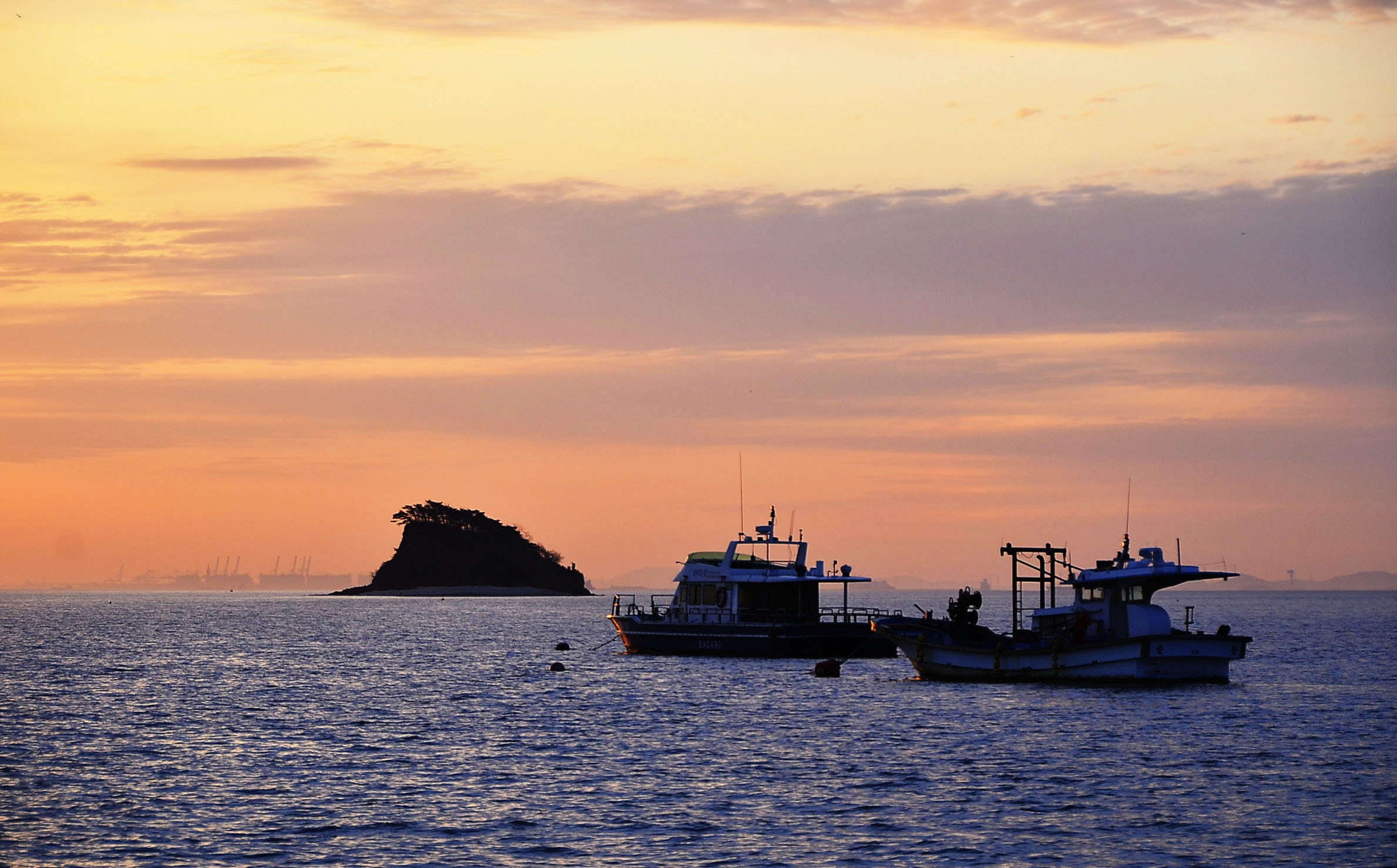 매도랑 샤크섬 앞에 정박하여 떠있는 배들이 일출과 섬과 아름다운 조화를 이루어냅니다.