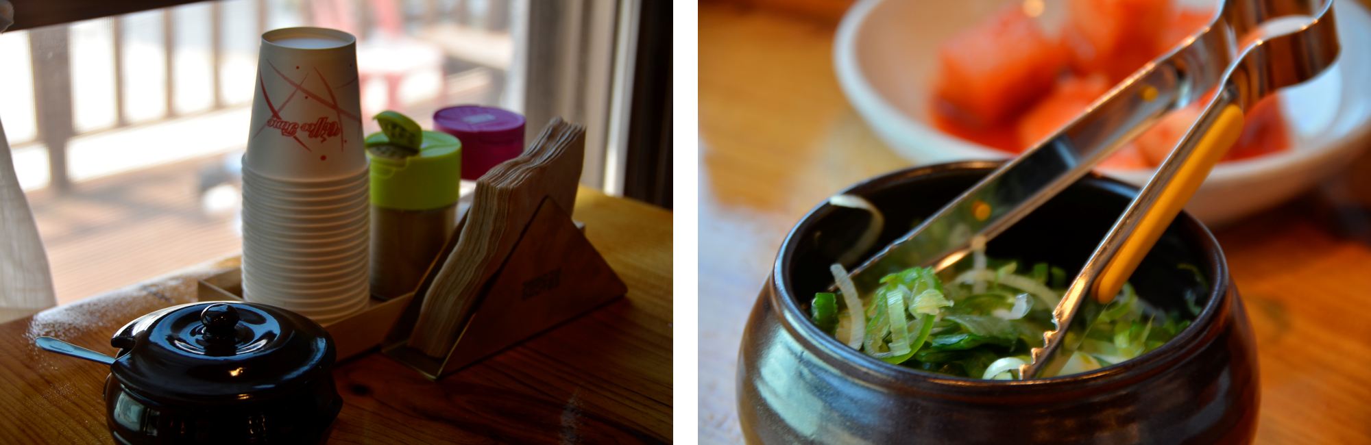 식당내 테이블에는 깔끔한 용기에 소금과 후추가 준비되어 있습니다.