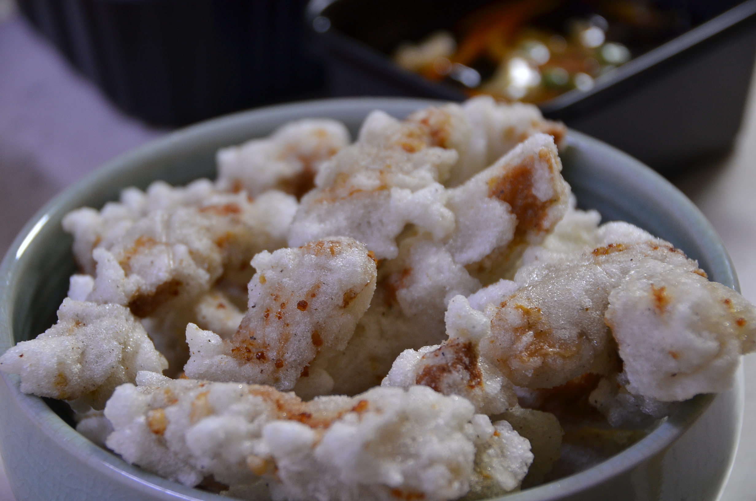 너무 달지도 시큼하지도 않은 소스를 듬뿍 찍어 고추가루를 적절히 뿌린 간장에 콕 찍어 입에 쏙 넣습니다.