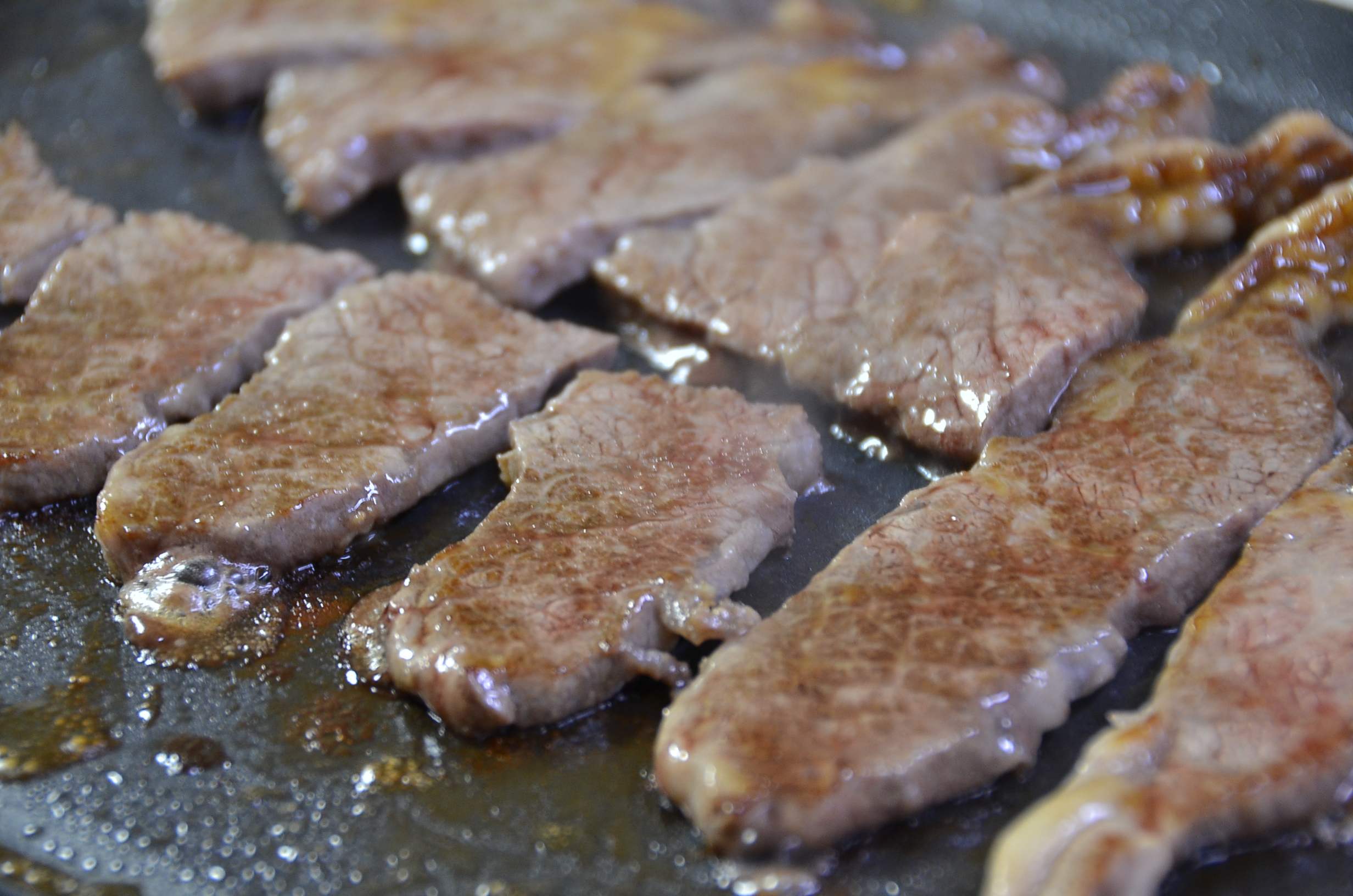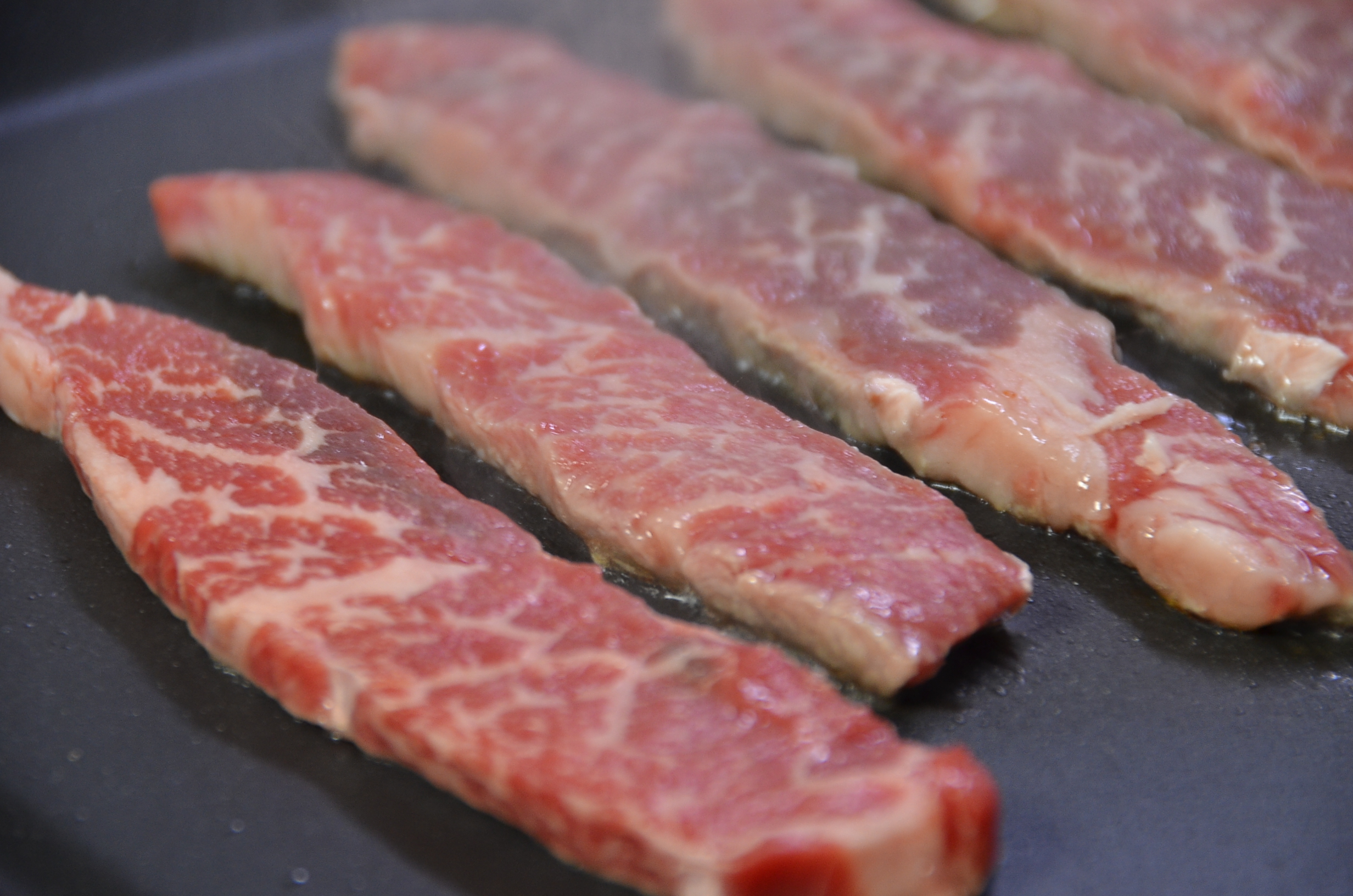 열기가 느껴질 정도로 가열이 되자 꽃갈비살을 올립니다.