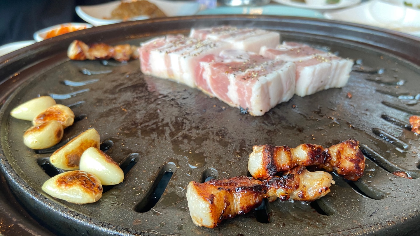 추가 주문한 삼겹살을 올리고 마늘도 한쪽에서 잘 굽습니다.