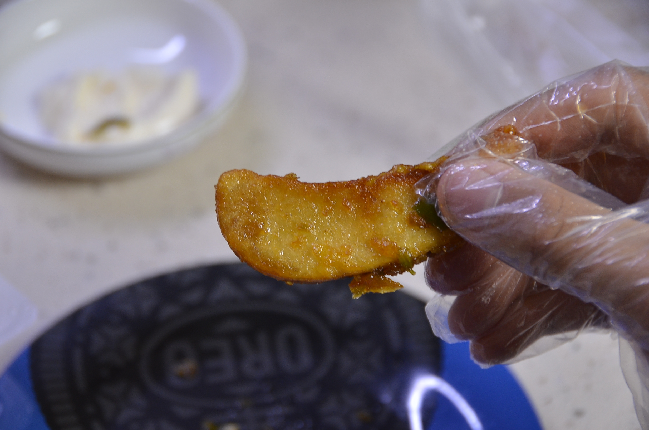 아들 녀석이 치킨 마니아답게 위생장갑을 착용하고 열심히 감자와 치킨을 먹습니다.