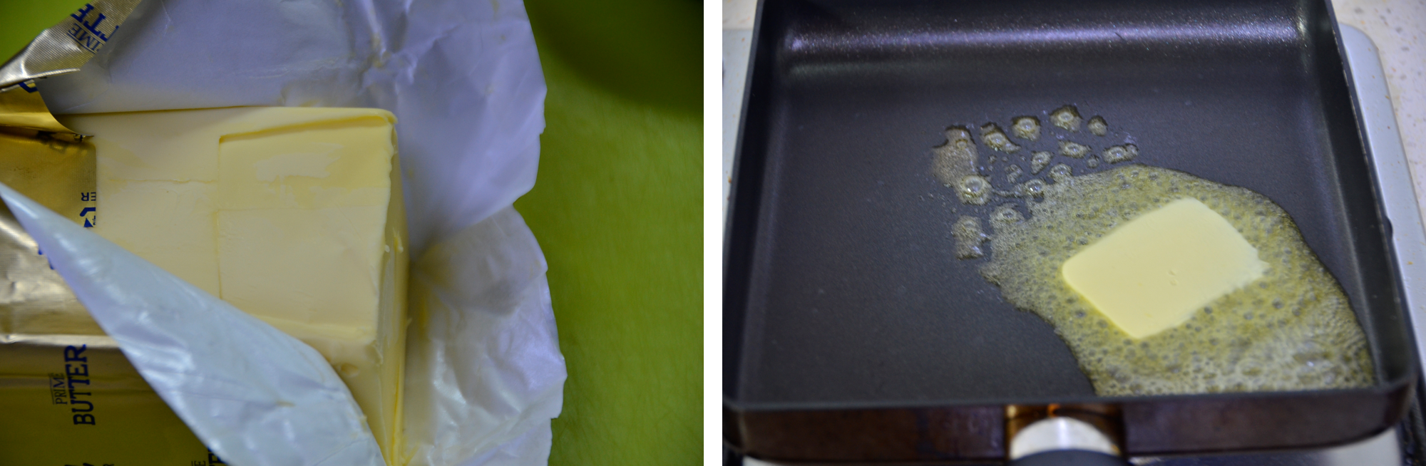 버터를 잘라 달구어진 팬 위에 올립니다.