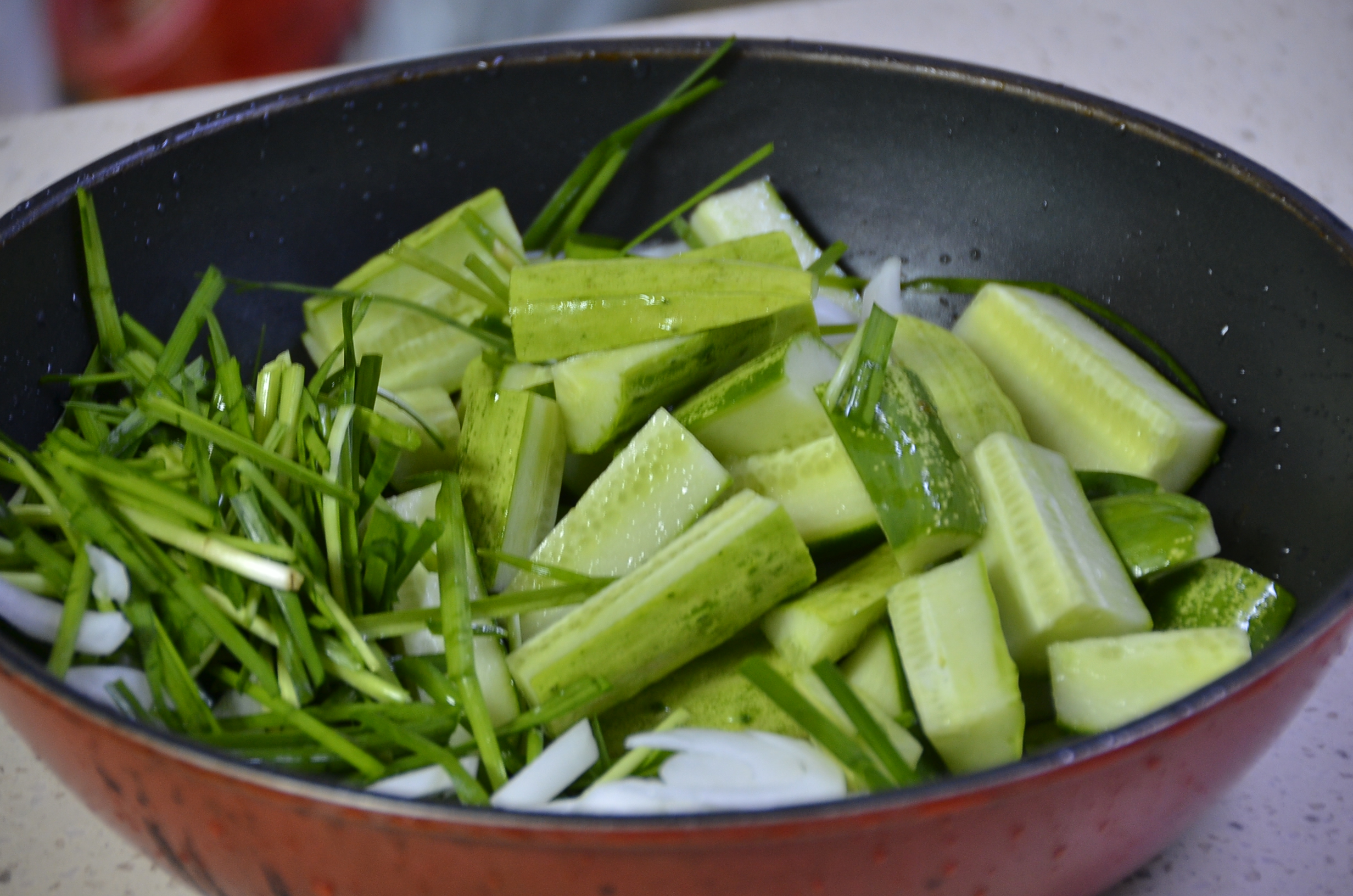 오이 두 개와 약간의 부추와 양파로 빠르게 반찬이 다 만들어졌습니다.