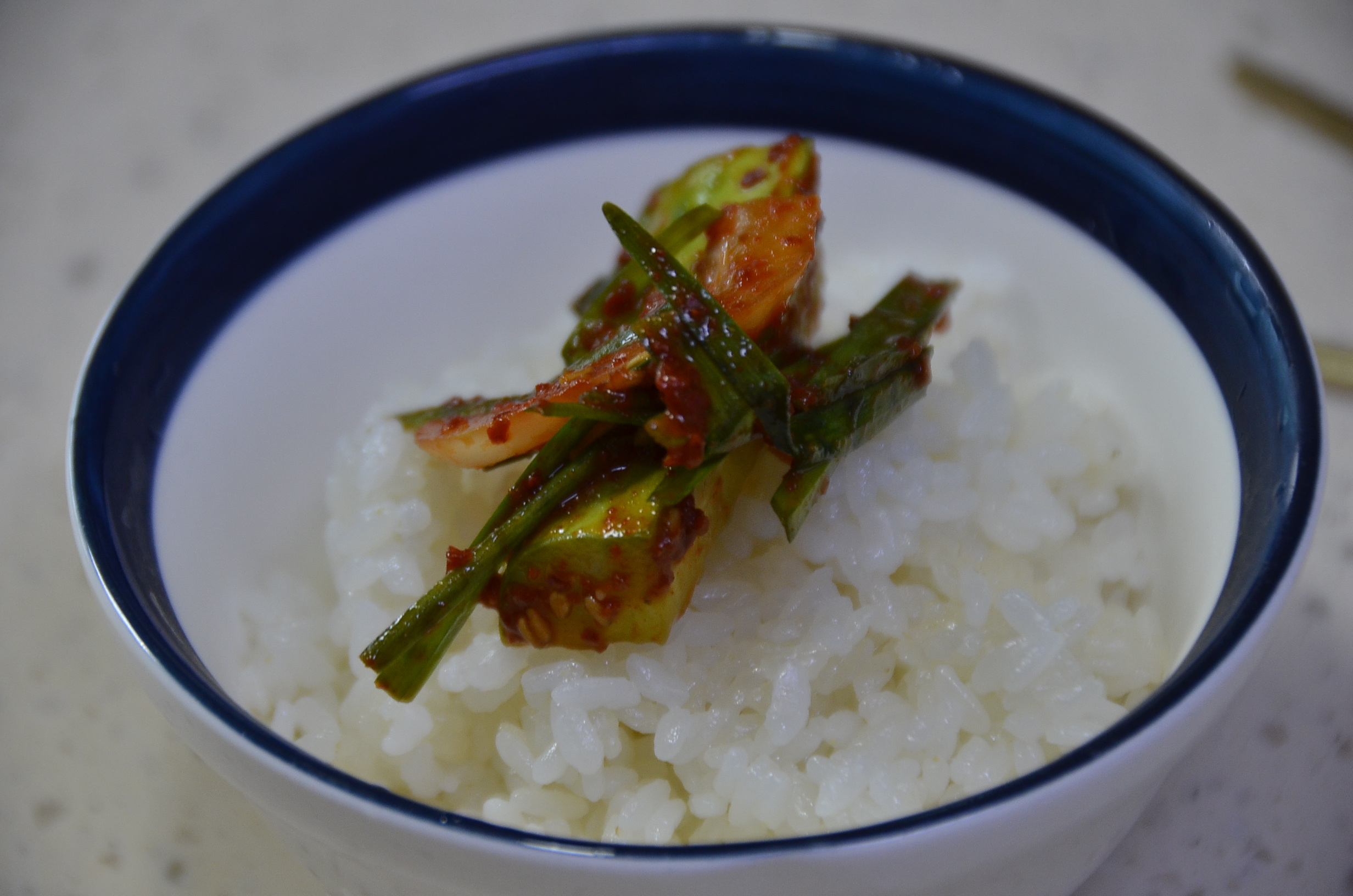 쌀밥 위에 오이 부추 무침이 올라가 있습니다.