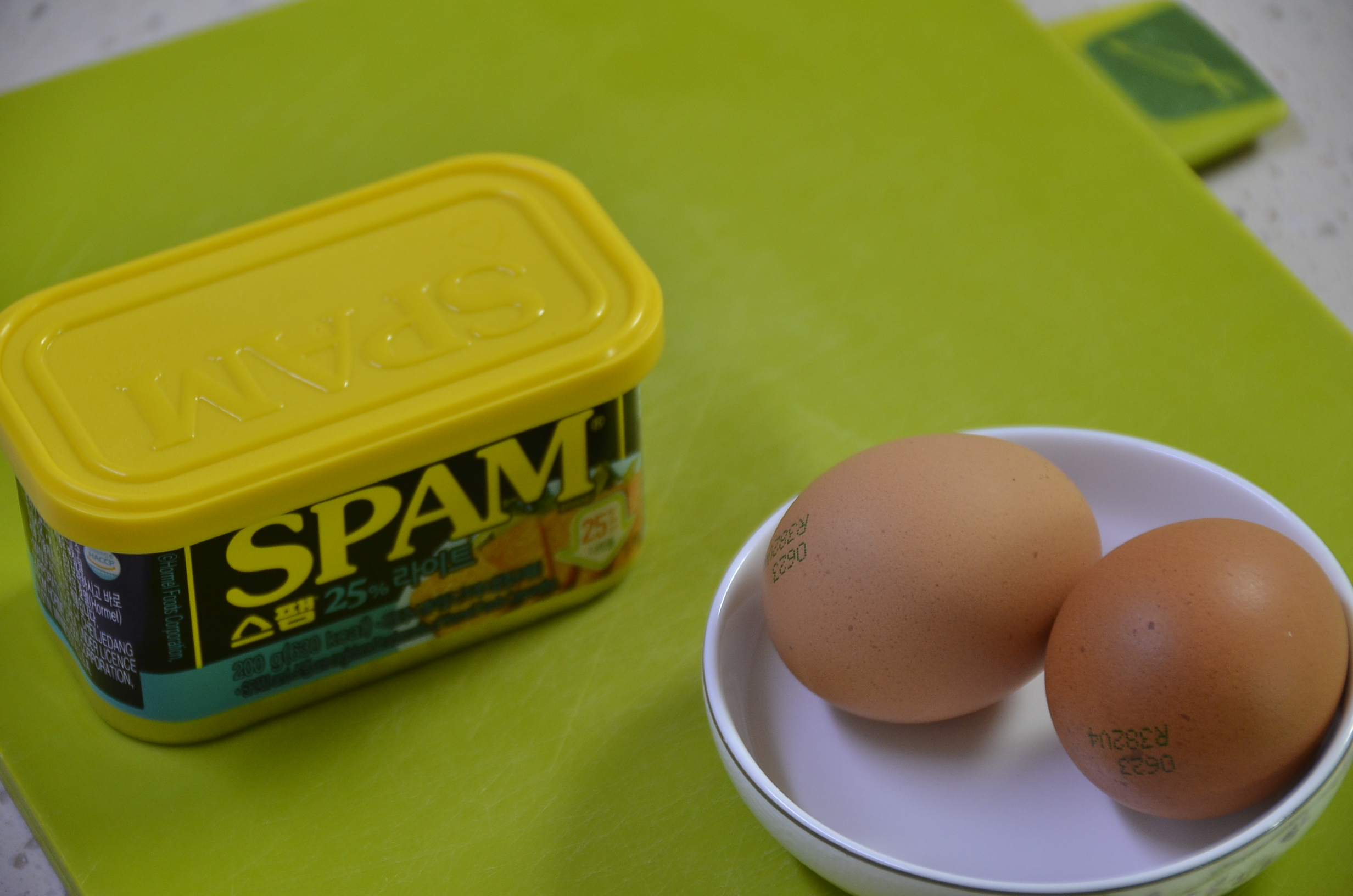 오늘 아빠의 생존 요리 중 가장 기본이 되는 주재료 스팸과 계란입니다.