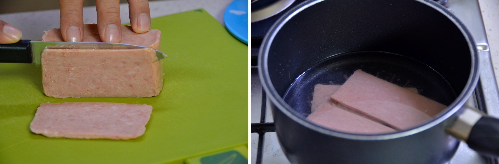 스팸을 아주 얇게 잘라줍니다. 스팸 구입 시 염분기가 25% 라이트 한 스팸을 구입했지만, 건강을 위하여 한 번 더 염분기를 빼내어 줍니다. 끓는 물에 살짝 데쳐서 다시 구어 줄 예정입니다.