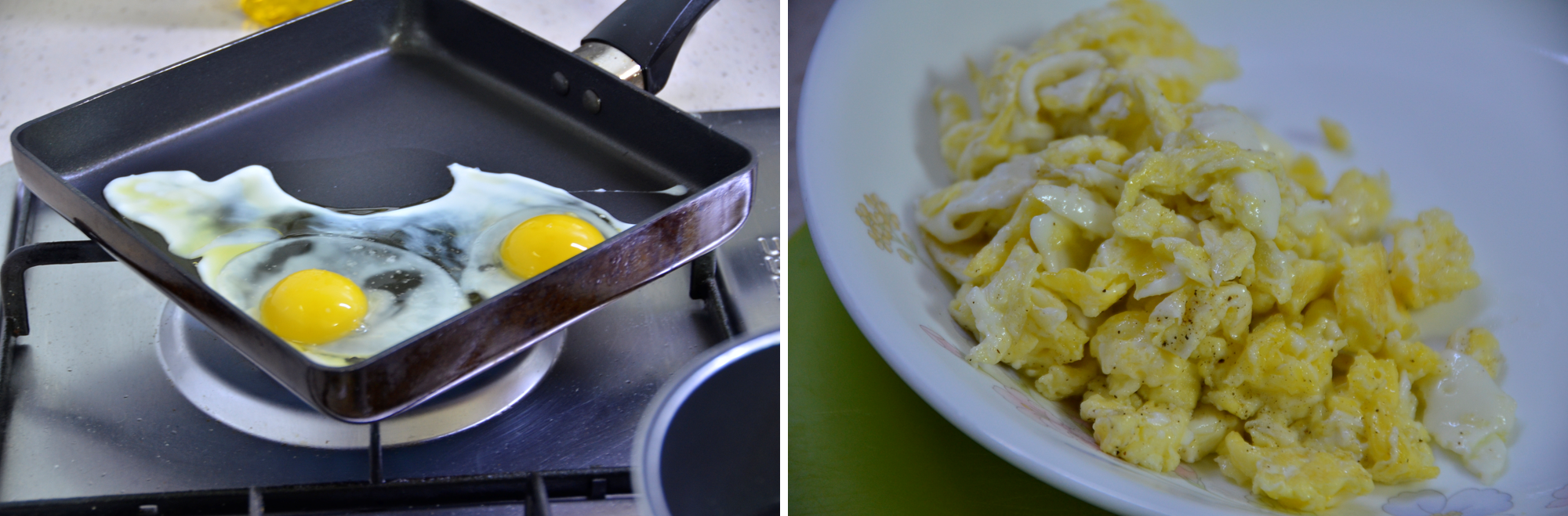 이번에는 계란 스크램블을 만들어 줍니다. 계란 두 개를 팬에 두르고 후추를 뿌려 휘저어 주면 맛있는 스크램블이 됩니다. 맛집 탐방 및 요리하는 티브이 애청자인 아들이 왜 아빠는 계란을 먼저 풀어서 예쁘게 노란색이 나오게 하지 않냐고 묻습니다. 저는 쉽고 간단하게 그리고 설거지 거리가 나오지 않게 하는 것이 아빠 요리의 특징이라 하니 바로 이해합니다.