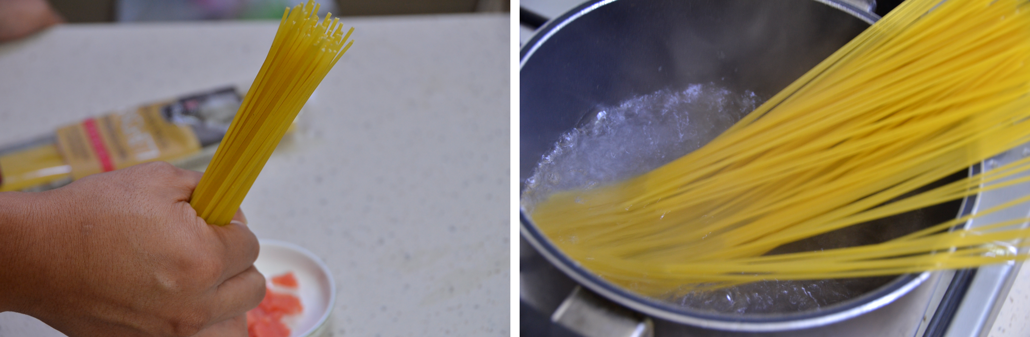 아들의 말을 존중하여 조금 더 파스타를 삶습니다. 파스타 삶을 때 명란젓으로 충분한 간이 되기 때문에 소금을 더 넣거나 하지 않습니다.