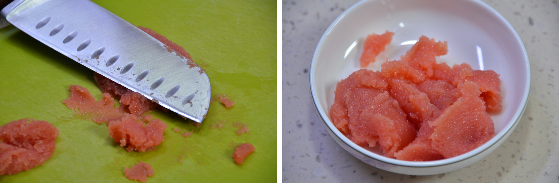 명란젓은 껍질 벗겨서 알만 준비하는데, 명란젓을 반으로 잘라 식칼로 눌러주면 쉽게 껍질과 알을 분리할 수 있습니다.