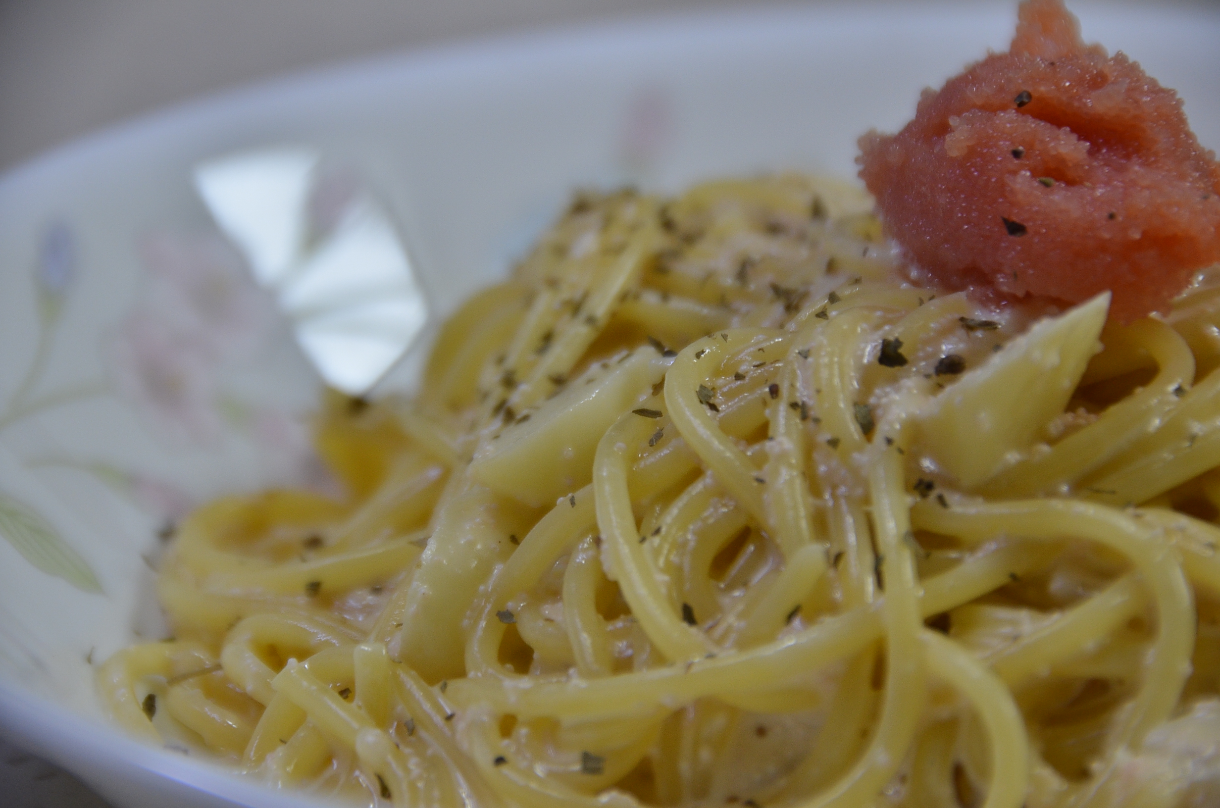 접시에 잘 옮겨 놓고 파스타 맨 위에 남은 명란젓을 토핑으로 올려줍니다. 개인 취향으로 다 섞어 먹어도 맛있고 조금씩 파스타와 함께 먹어도 더 맛있는 신의 한 수입니다.