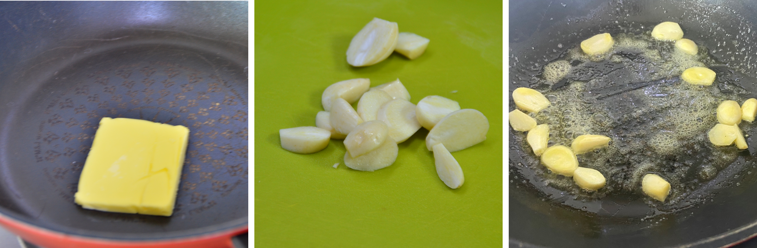 버터를 팬에 올려 팬을 가열합니다. 편 마늘을 버터에 구워줍니다.