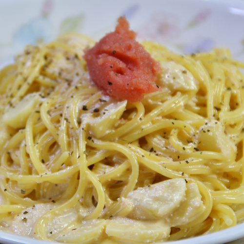 그 후에 명란젓을 함께 넣어 잘 섞어줍니다. 명란젓으로 파스타의 간이 아주 잘 맞을겁니다.
