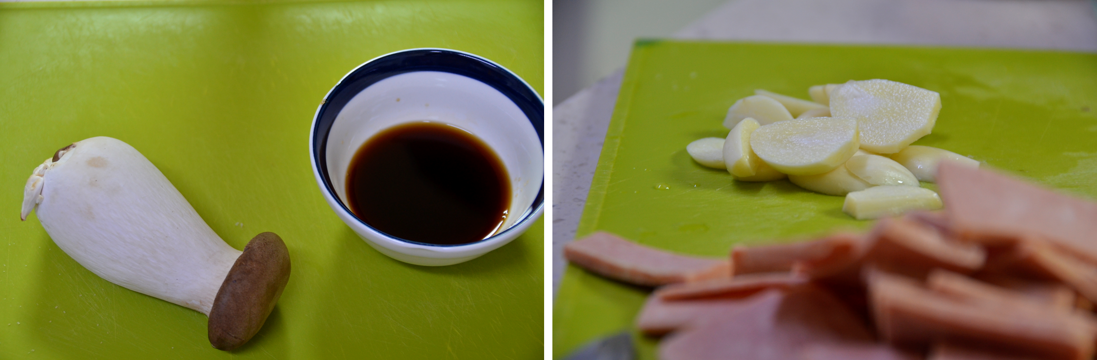 저는 그사이에 마늘과 햄을 준비합니다. 메인 부재료인 새송이 버섯 또한 먹기 좋은 크기로 길게 길게 잘라줍니다.