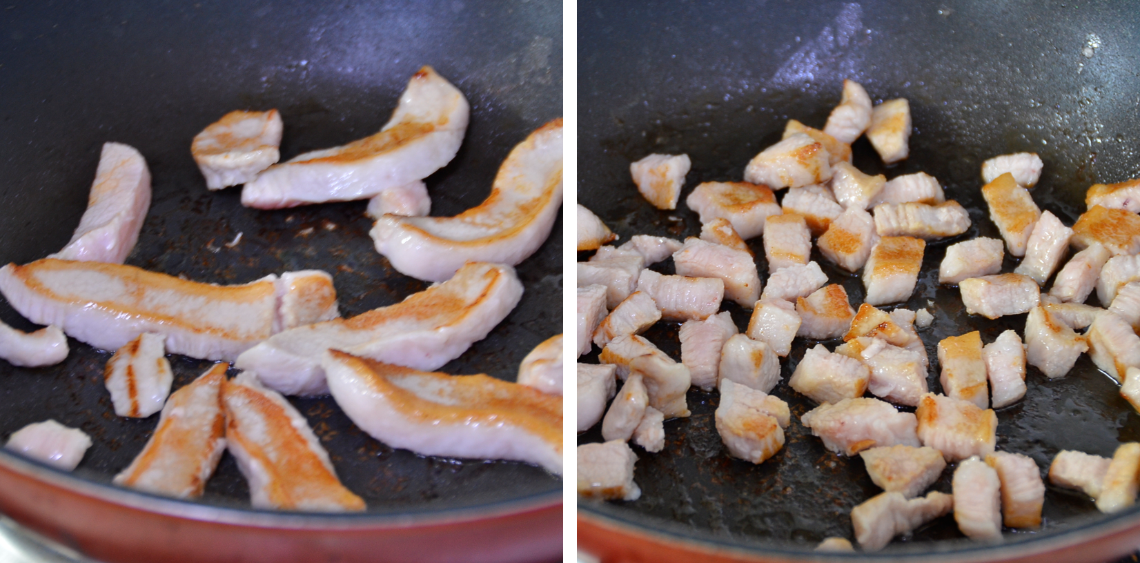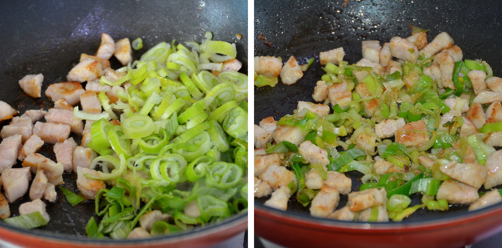 항정살을 볶은 후 바로 파를 넣어 우측과 같은 색이 나올 때까지 고기와 함께 볶아줍니다.