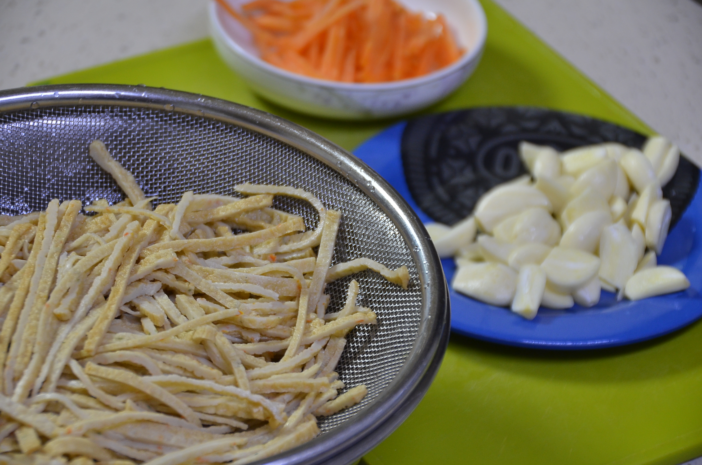 어묵은 그냥 조리해도 좋다고 하지만 기분이 썩 좋지 않기에, 위생을 생각하여 물로 한번 깨끗이 씻어줍니다. 그리고 채에 올려 물기를 깨끗히 제거하여 줍니다. 그동안에 각종 야채를 준비하면 바로 조리할 수 있는 시간이 됩니다.