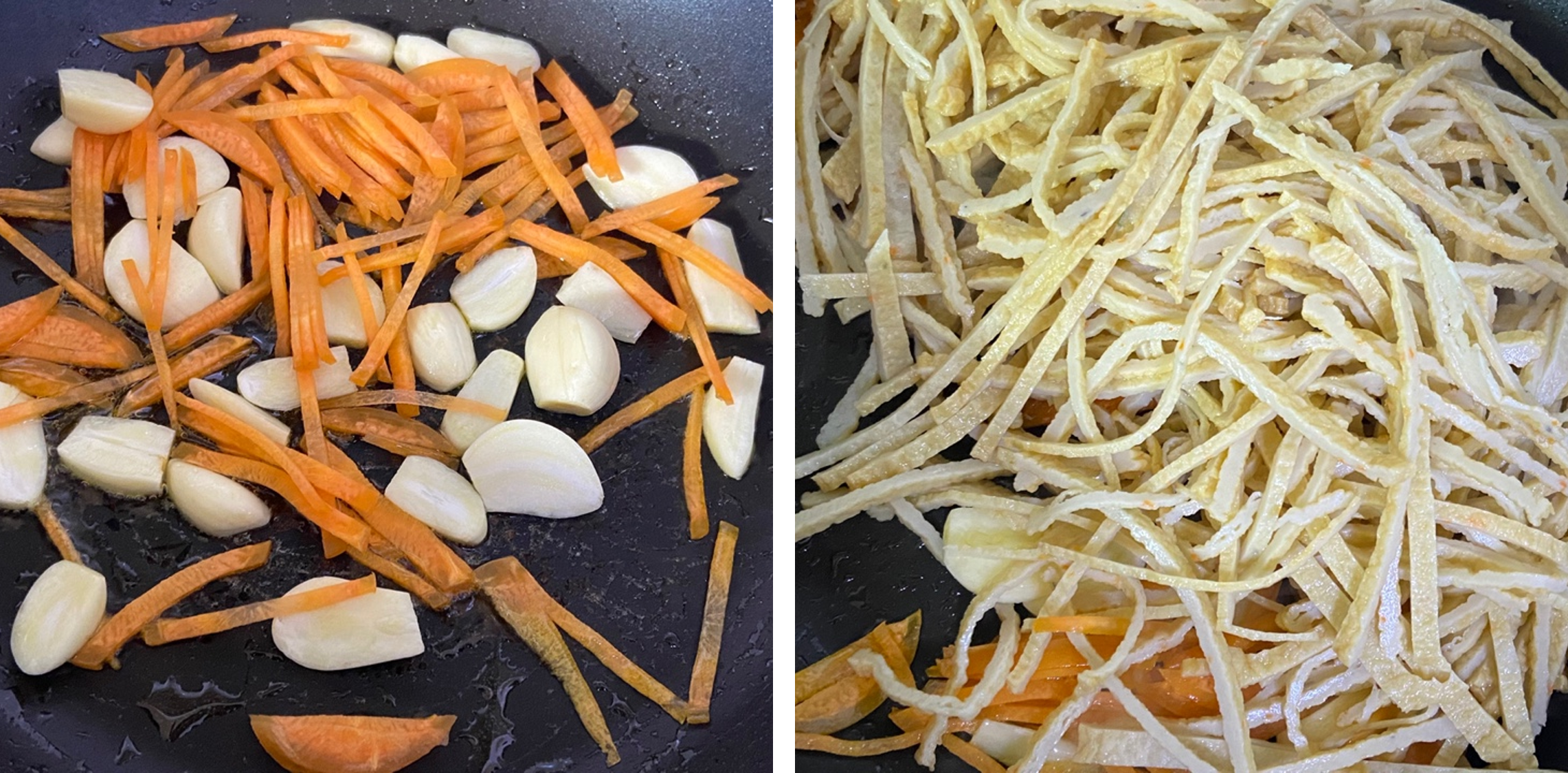 마늘과 당근을 기름 두른 팬에 올리고 살짝 볶아줍니다.