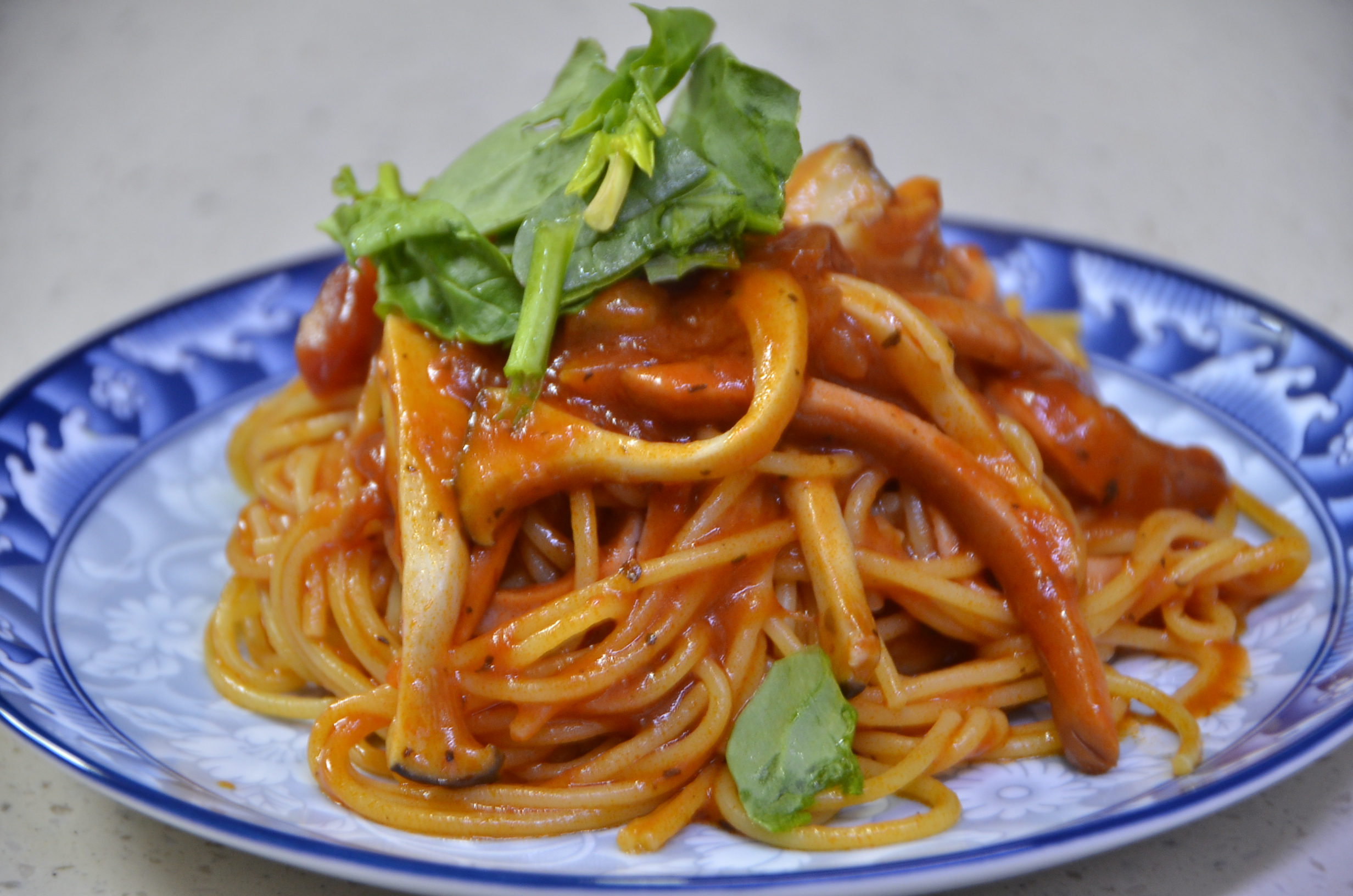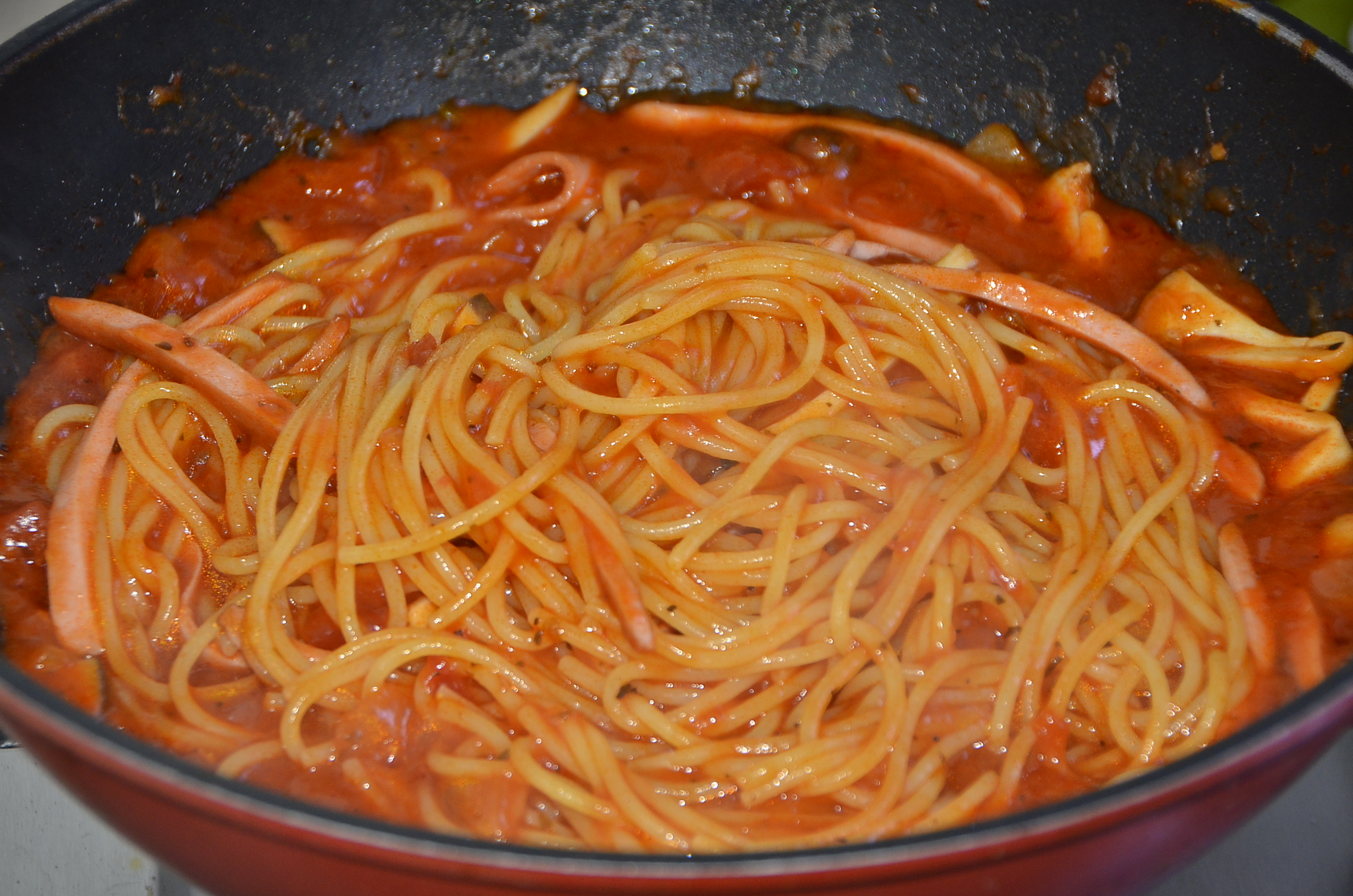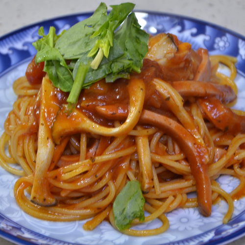 듬성듬성 보이는 새송이 버섯과 햄의 콜라보 그리고 토마토소스로 붉게 물든 스파게티 면의 조화가 딱 봐도 맛있는 요리입니다. 비주얼은 확실한 성 공각입니다.