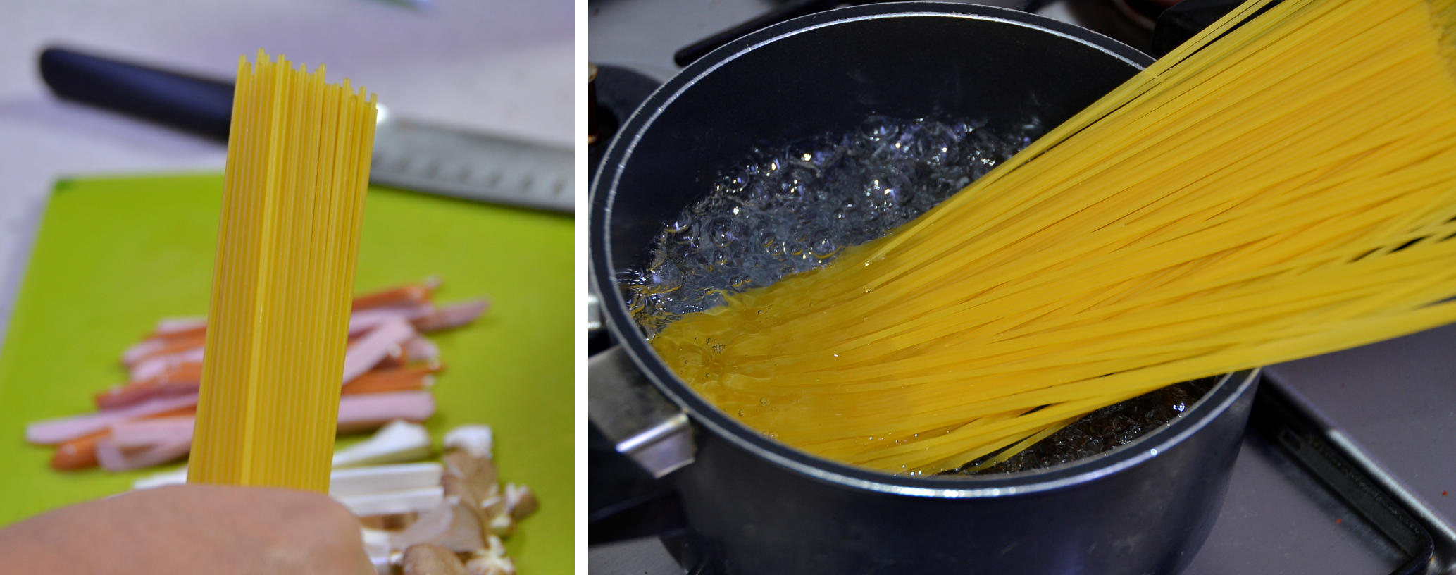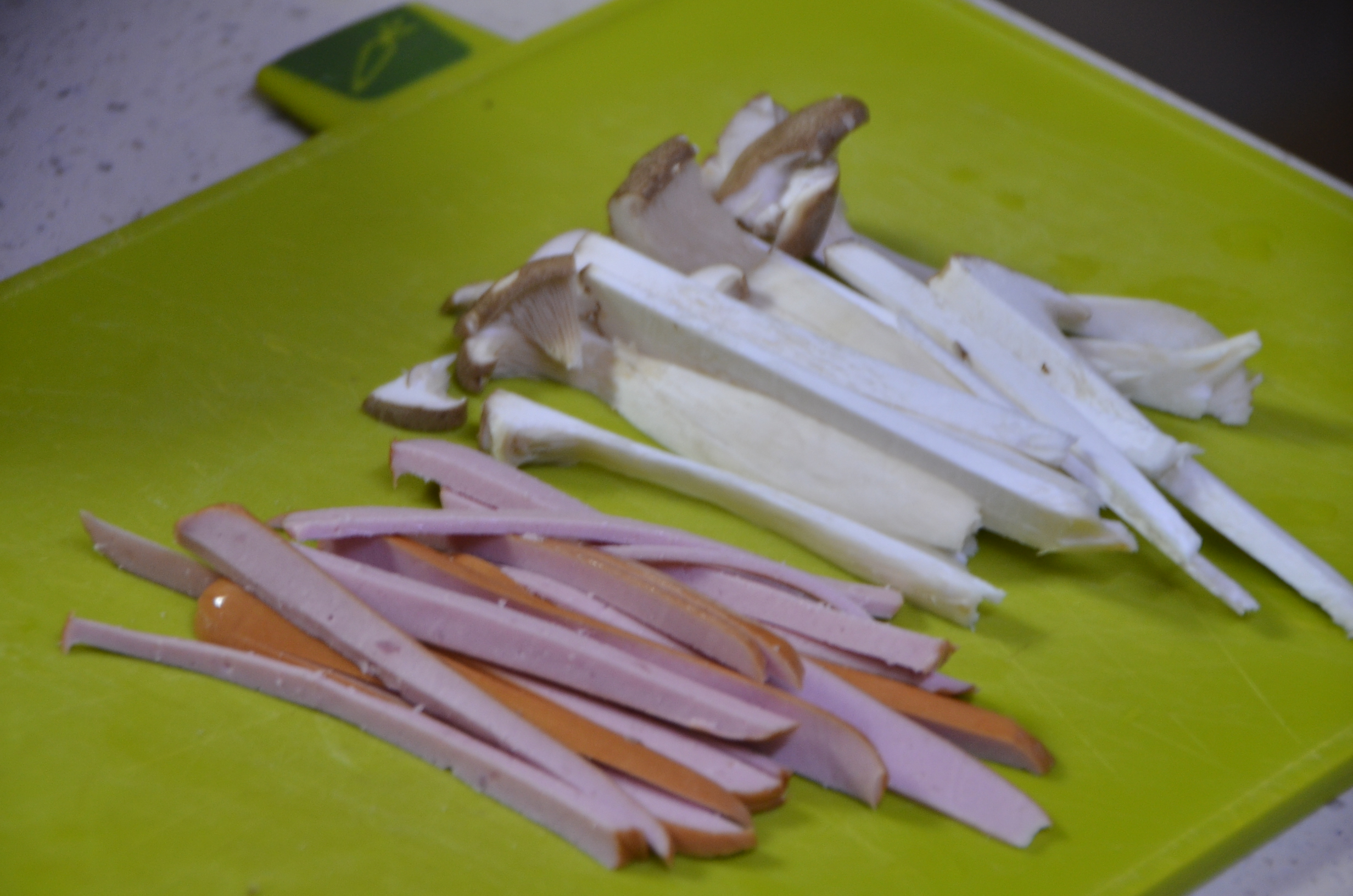 스파게티 면과 같이 흡입하기 편하도록 새송이 버섯과 햄을 길게 또 얇게 잘라 손질하여 줍니다.
