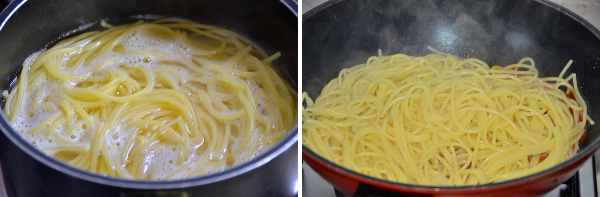 하지만 적당히 익은 면을 팬에 옮겨 2차 조리를 하면 토마토 소스도 면에 스며들어 풍미 가득한 맛 좋은 스파게티가 완성됩니다.