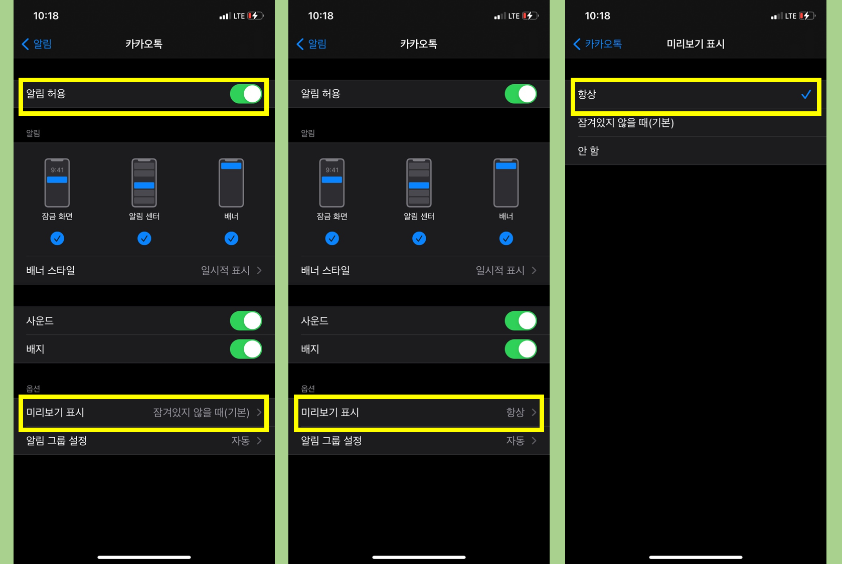 5. 알림허용 상태창을 활성화 하자 화면이 추가로 보입니다. - 휴가중 저에게 메세지를 보내는 사람들과의 적극적인 소통을 위하여 추가로 미리보기 표시도 설정합니다.