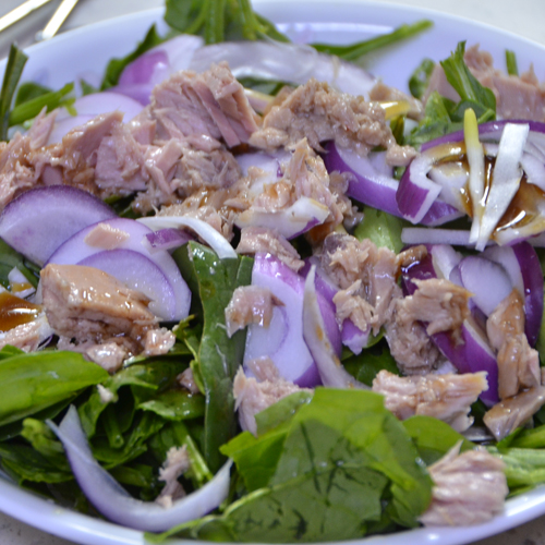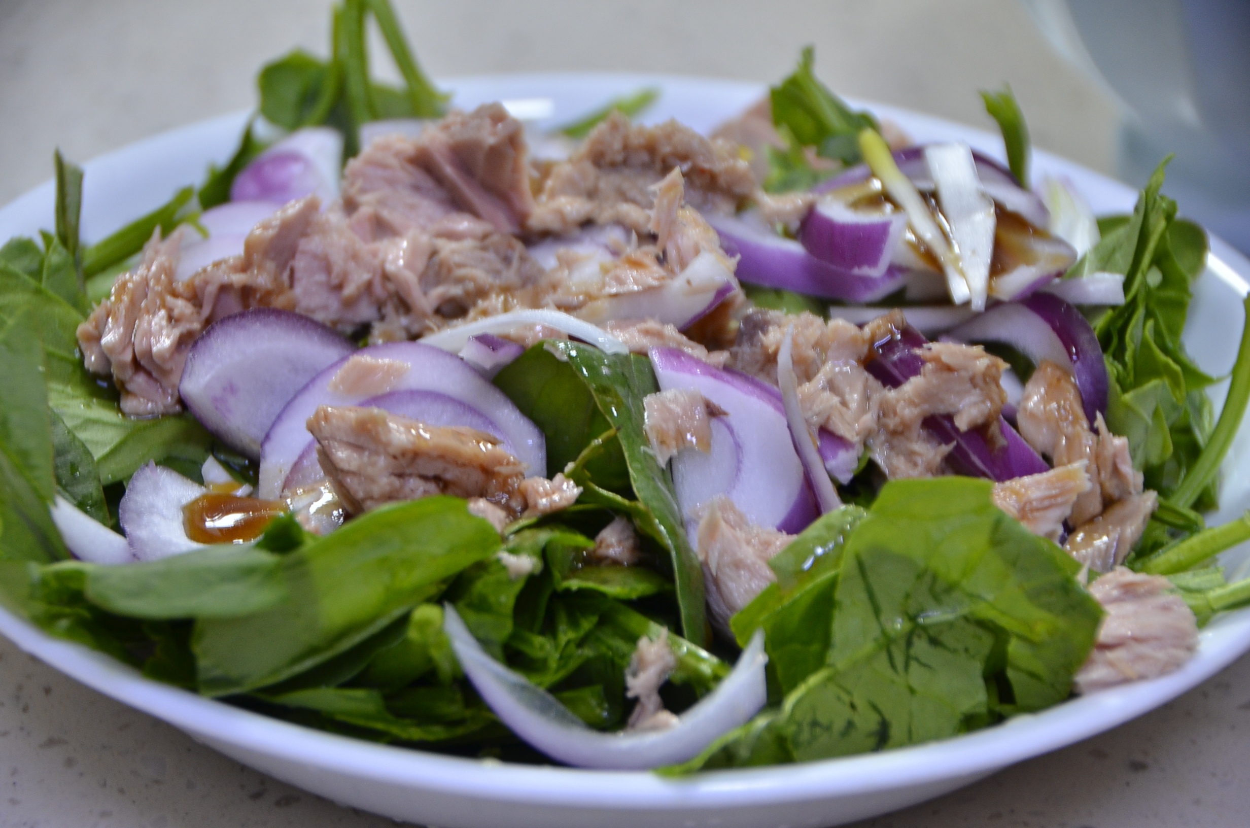 초록초록 그린 그린 한 시금치 샐러드에 붉은색 양파와 참치가 한데 어우러지니 색도 참 예쁜 것이 먹음직스럽습니다. 이 비주얼과 추가한 참치로 인하여 아들 젓가락이 움직이기 시작합니다.