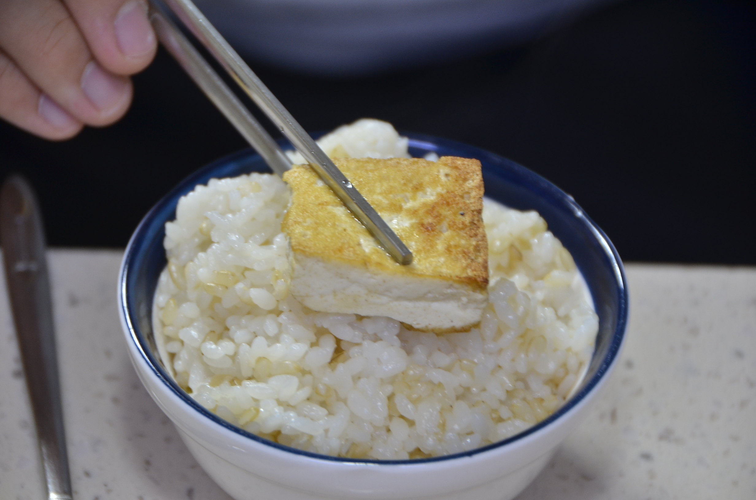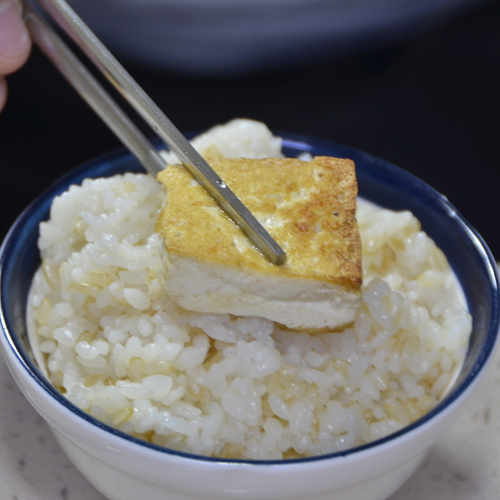 다이어트 식단에 꼭 필요한 현미밥 위에 들기름 두부구이를 올립니다.