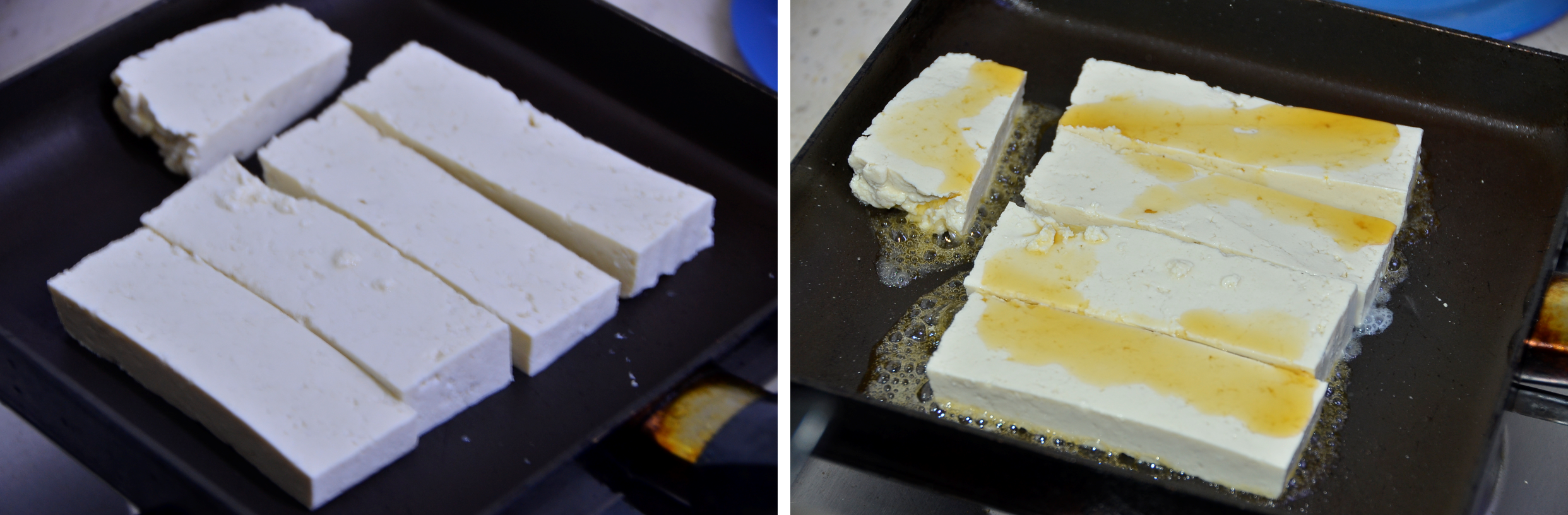 두부를 팬 위에 올리고 불을 올립니다. 제일 먼저 센 불에 시작하여 두부 위에 들기름을 뿌려줍니다.