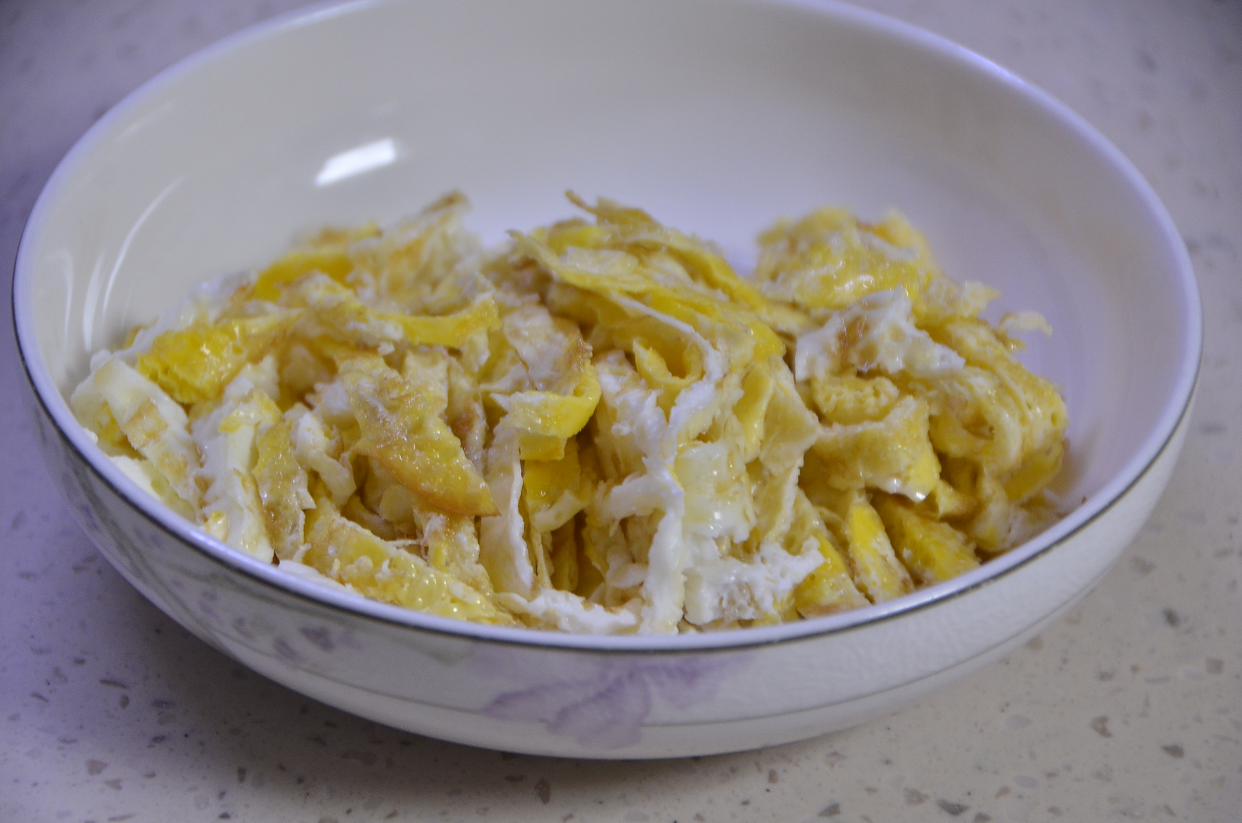 지단을 얇게 잘라줍니다. 이 지단은 마지막에 맛있어 보이는 떡국 데코에도 필수입니다.