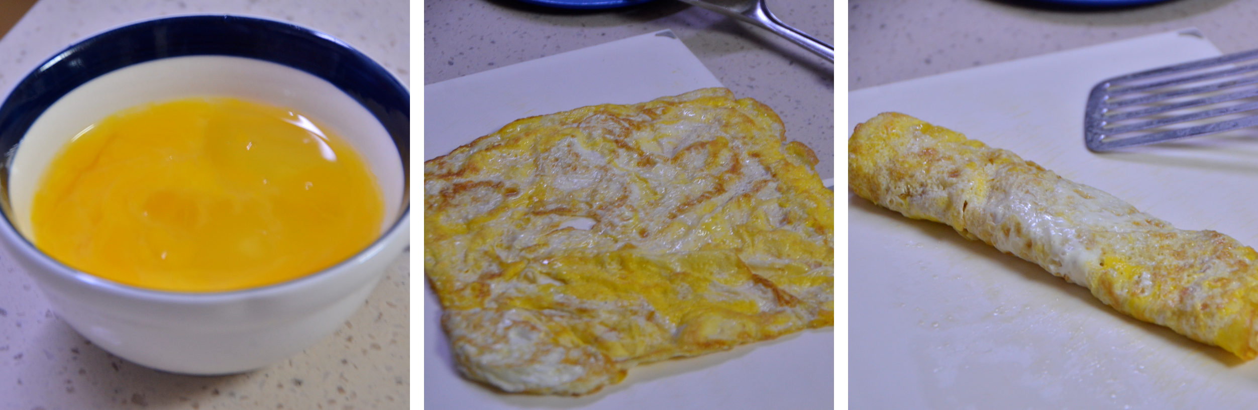 계란 지단을 한쪽에 잘 올려 줍니다.
