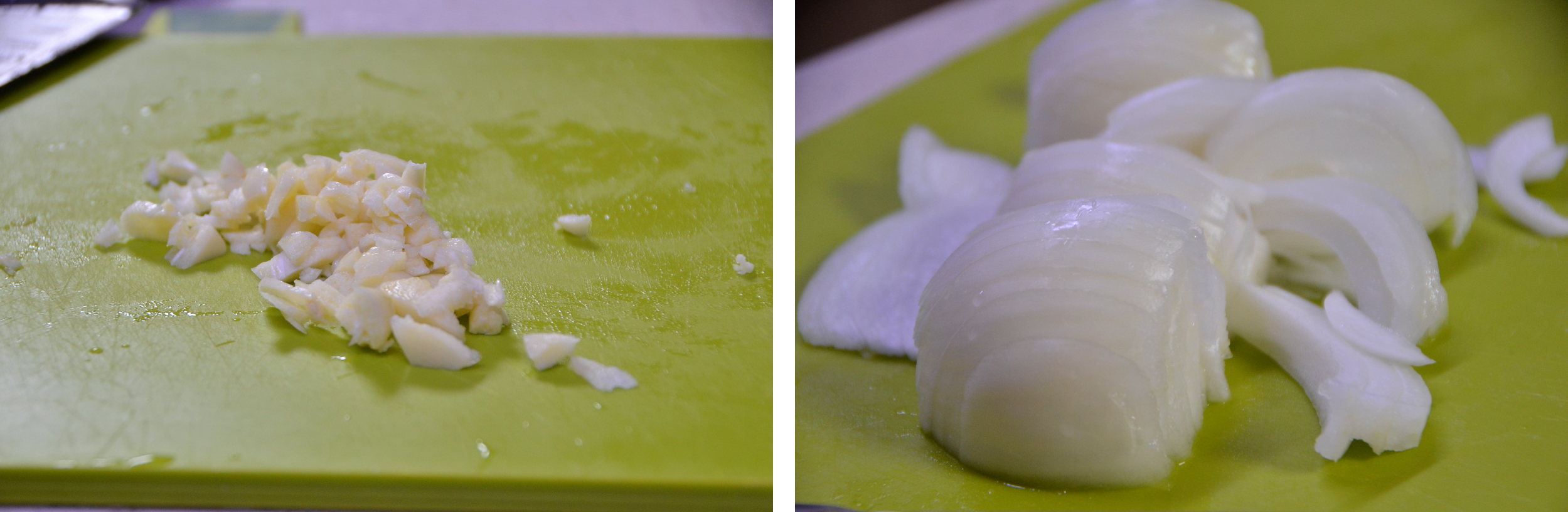 부재료인 마늘을 다져주고 양파를 얇게 잘라 준비합니다.