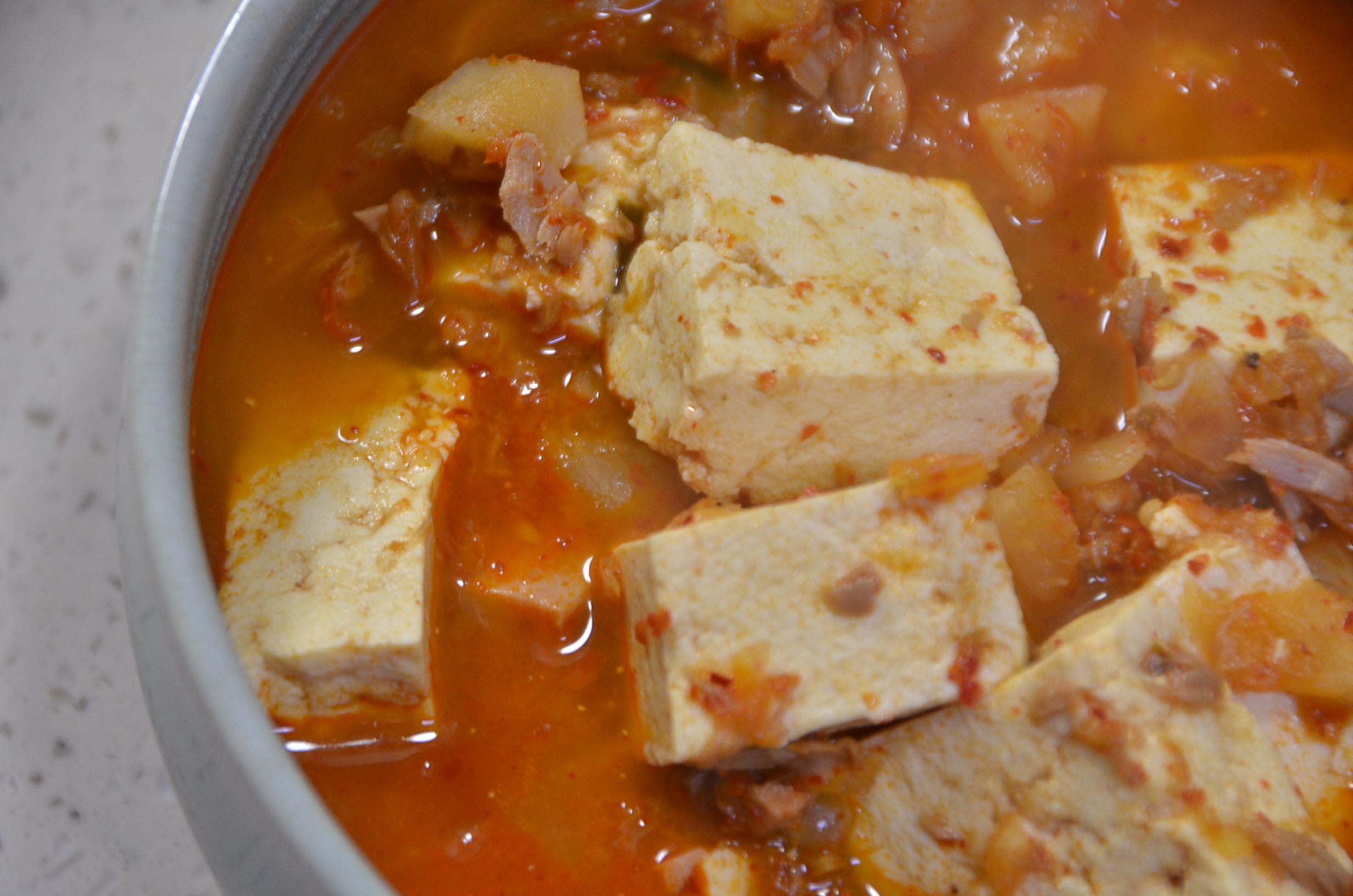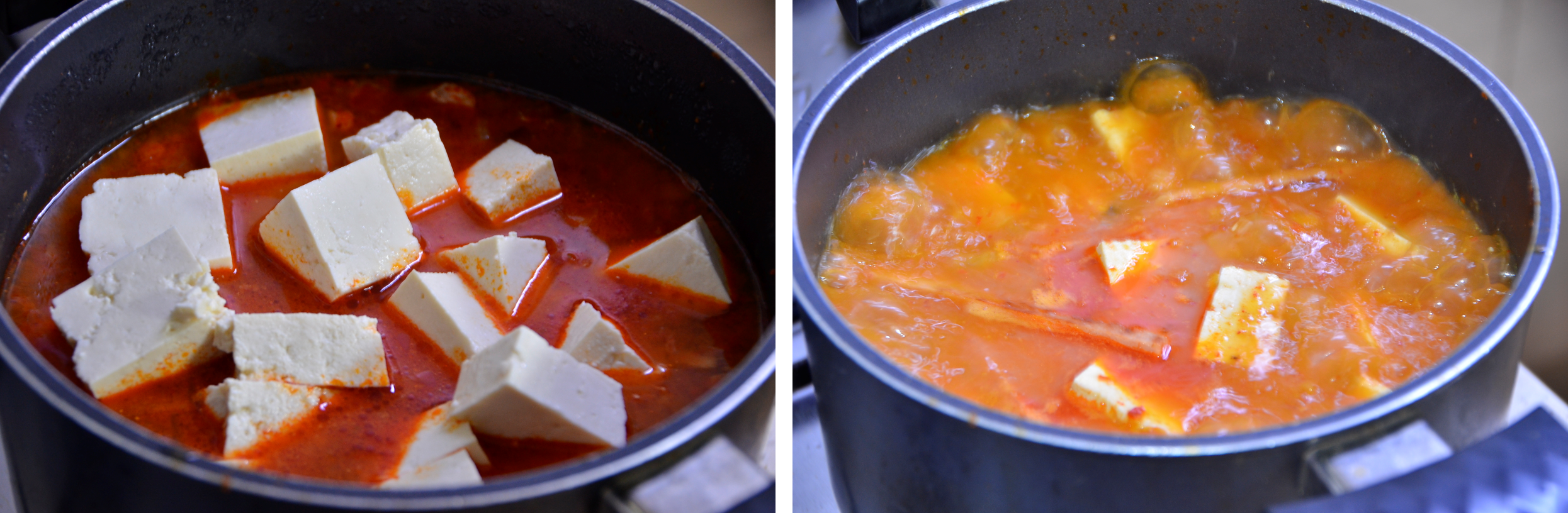 그리고 김치가 잠길만큼 충분히 물을 넣어줍니다. 그리고 그 위에 두부를 넣고 끓입니다.