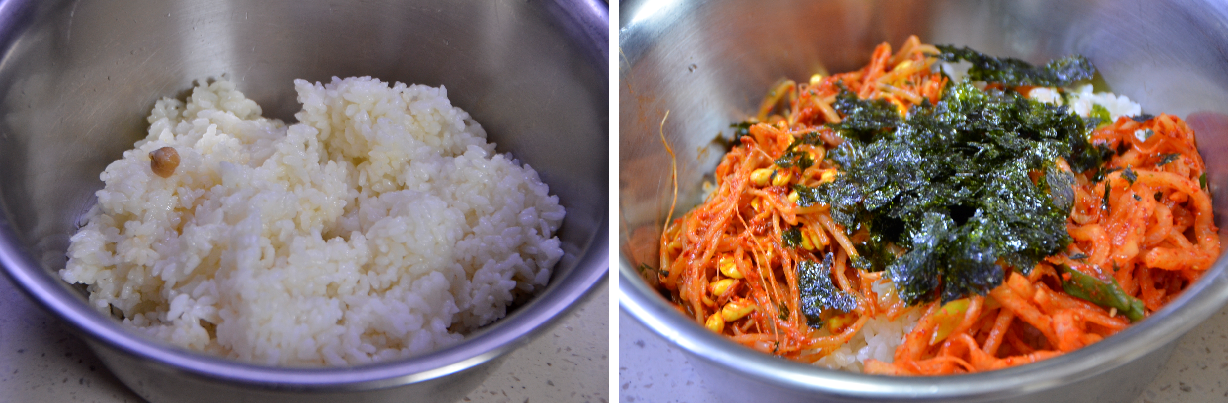 냉장고를 뒤져보니 콩나물 하나만이 있어 콩나물과 조미김을 주셔 무채와 함께 넣습니다.