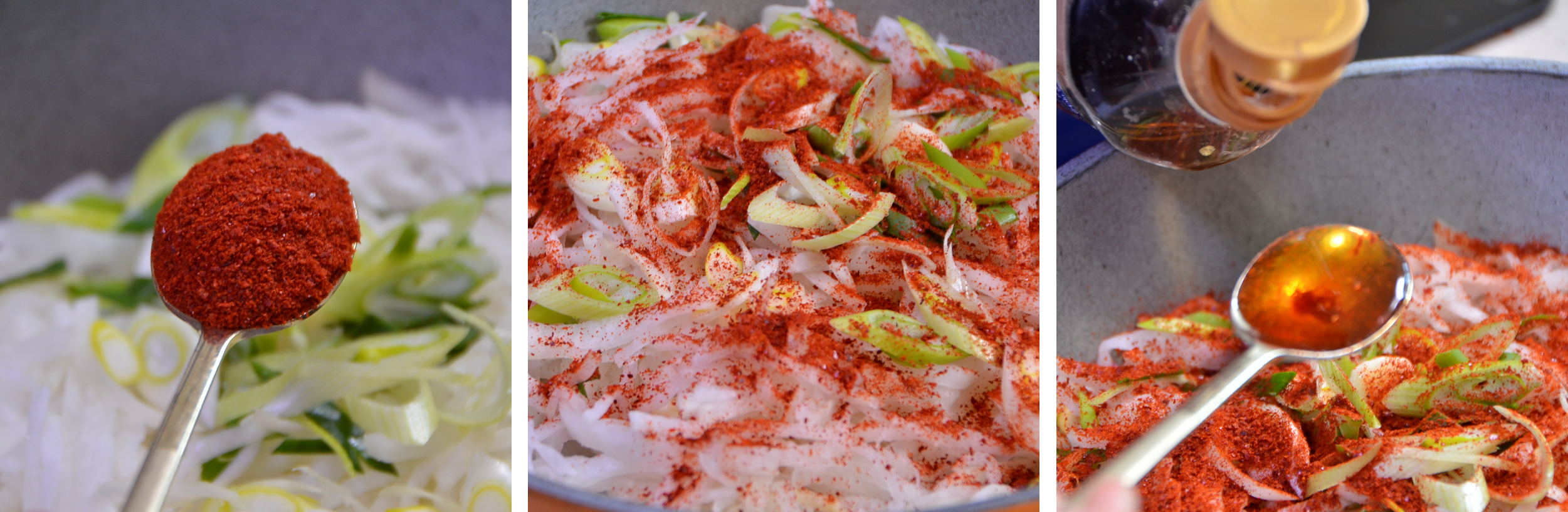 준비한 파와 무를 올리고 그 위에 고추가루를 뿌려줍니다.
