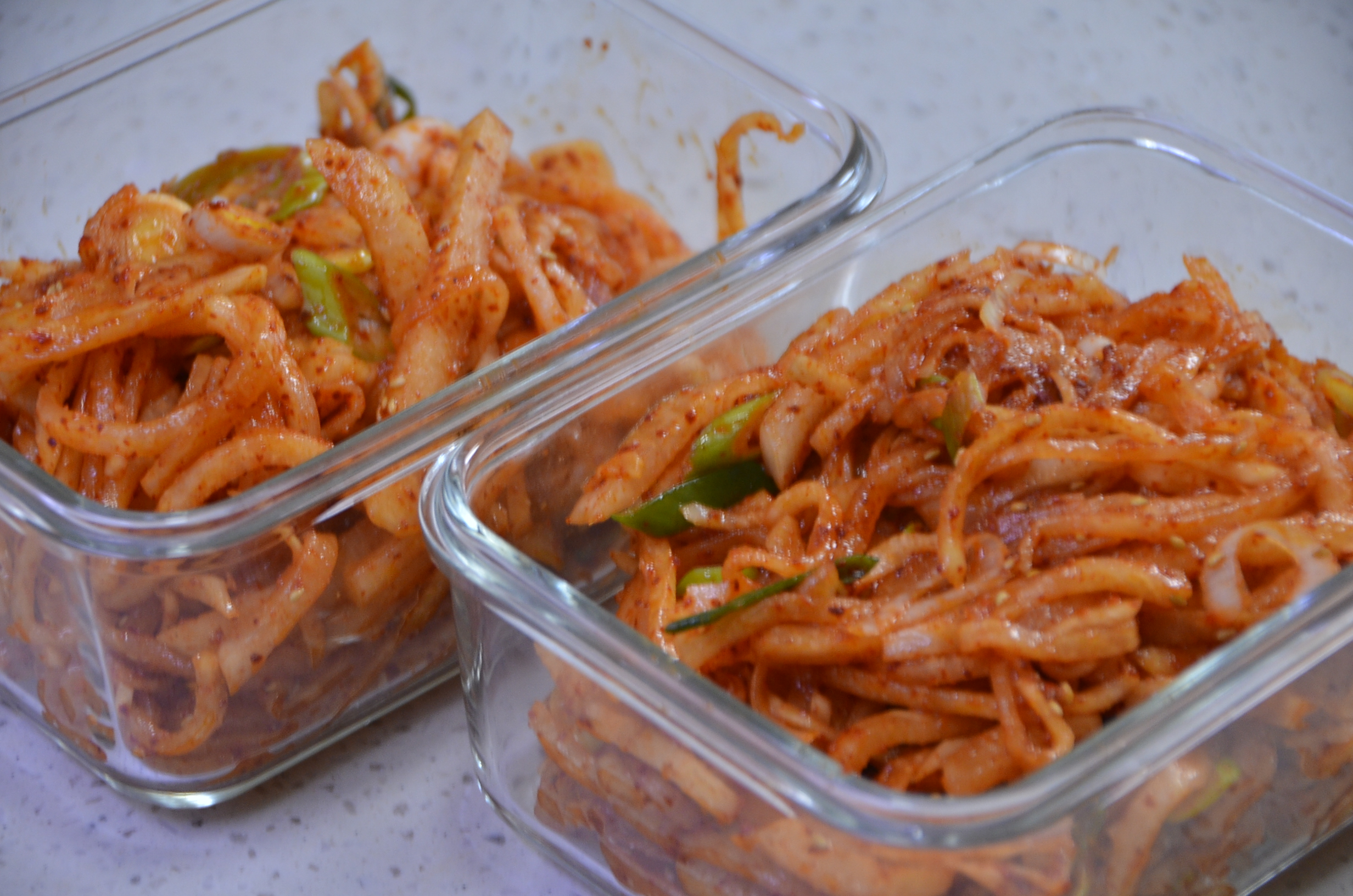 적당히 넓은 반찬통에 완성된 매콤새콤 무채를 넣습니다.