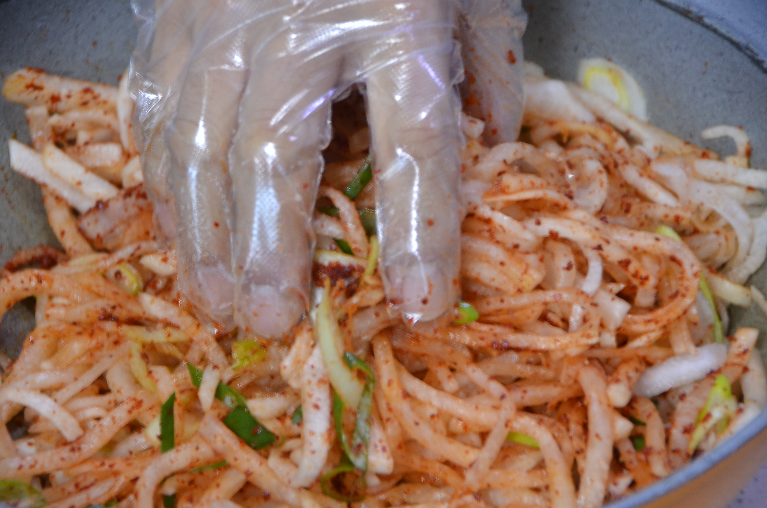 위생 장갑을 착용하고 손끝을 살려 고추가루와 각종 양념을 잘 버무려줍니다.
