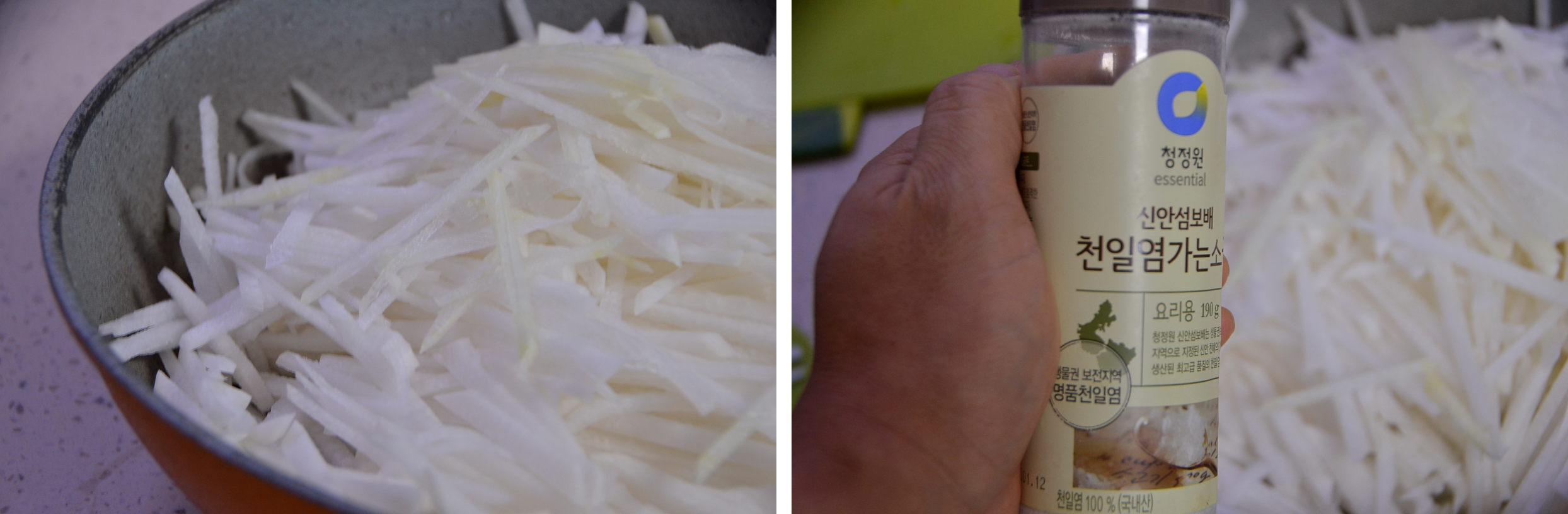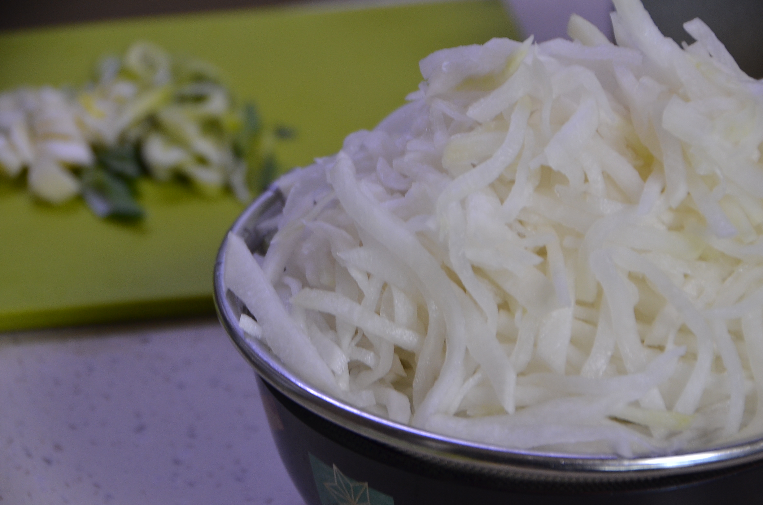 신선한 무를 채를 썰었습니다. 저는 채칼을 사용하지 않고 칼로 채를 썰어 준비를 하였습니다.