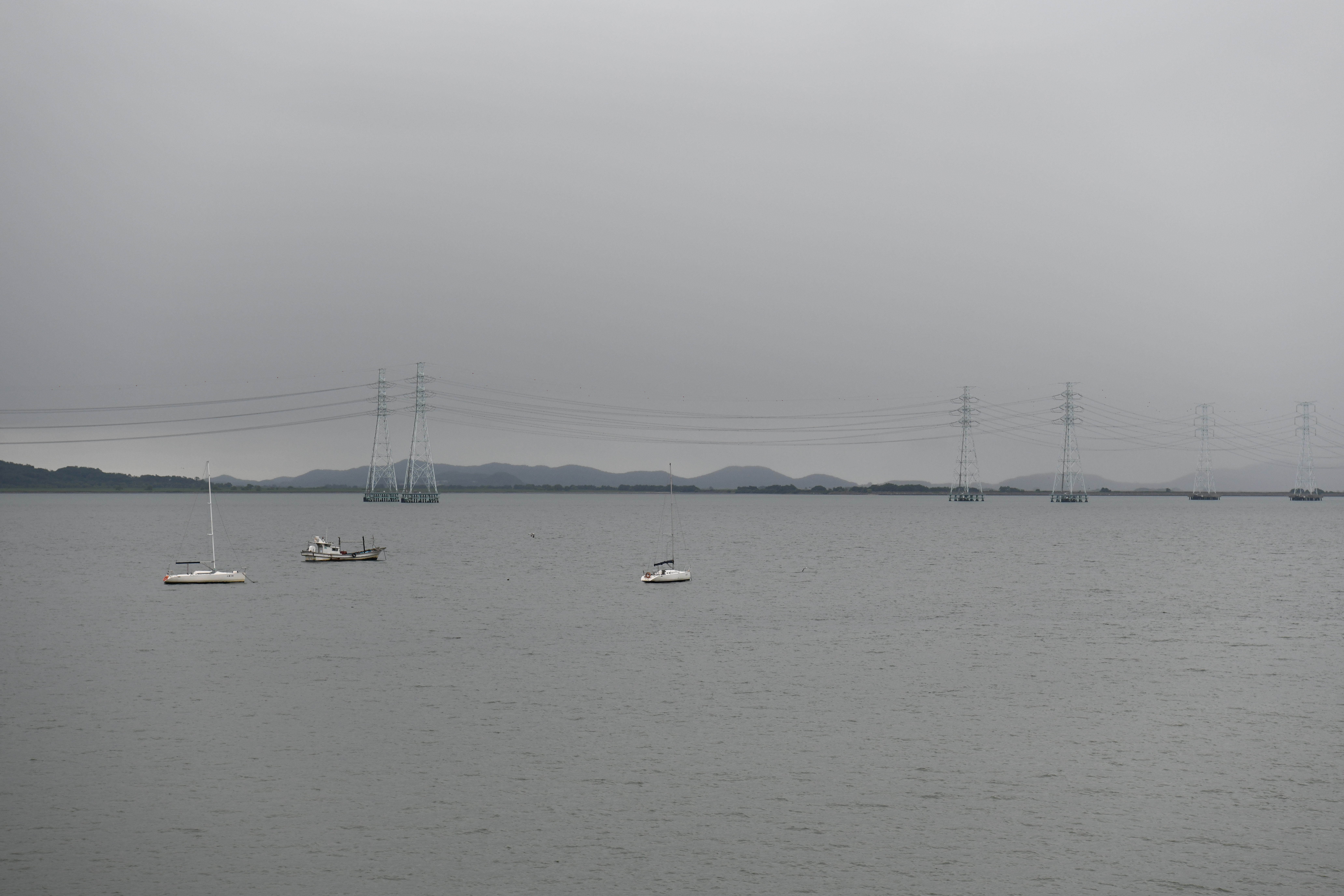 바다에 떠 있는 조각배와 바다 위 전신주를 떠받치고 있는 대형 부위가 참 대단합니다.