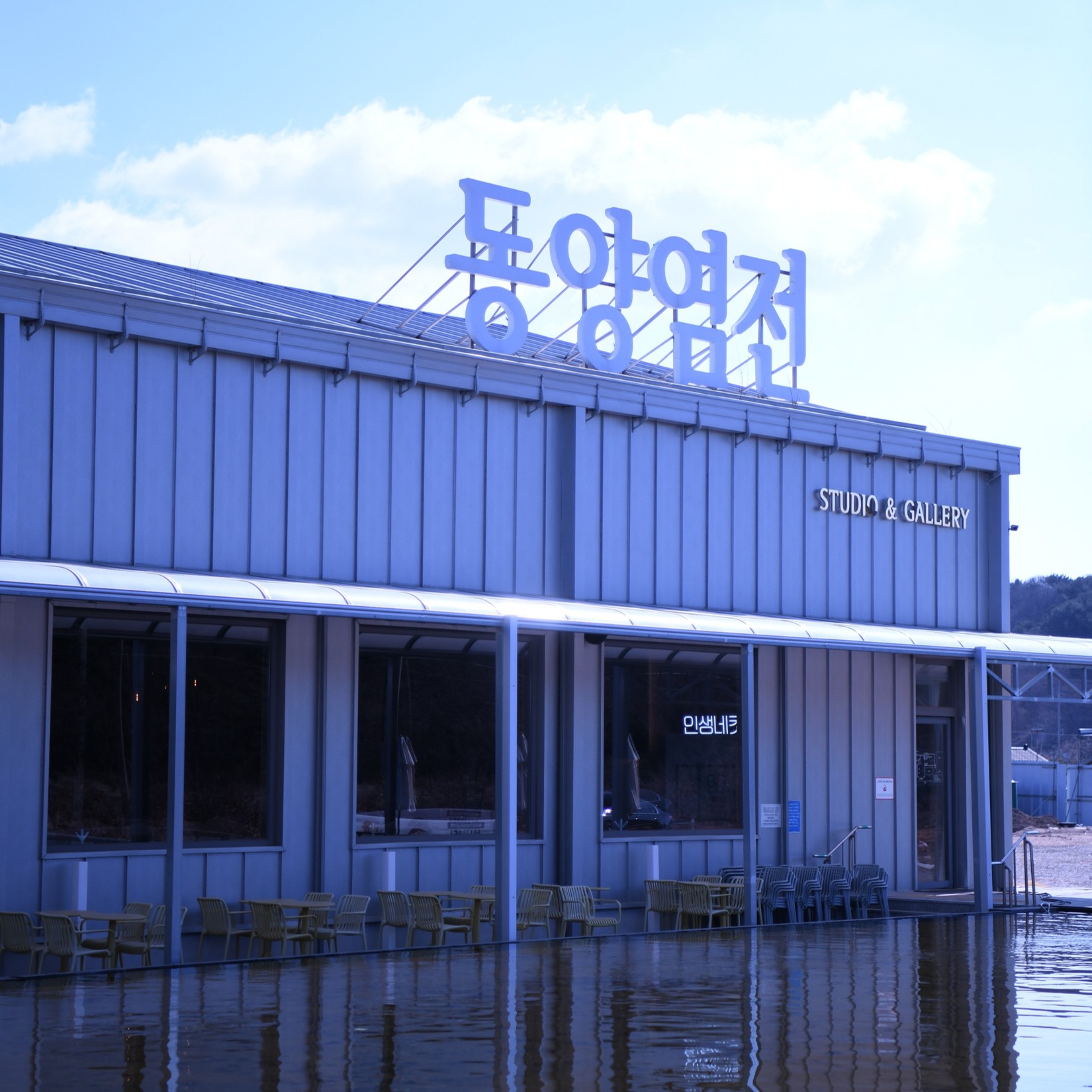 천장이 높아 탁 트인 느낌이 들고, 벽면은 노출 콘크리트의 그레이 톤으로 마감되어 있어 도시적인 감성과 함께 묘한 여유로움을 느낄 수 있습니다. 그 공간 곳곳에는 염전의 풍경을 담은 사진들이 전시되어 있어,