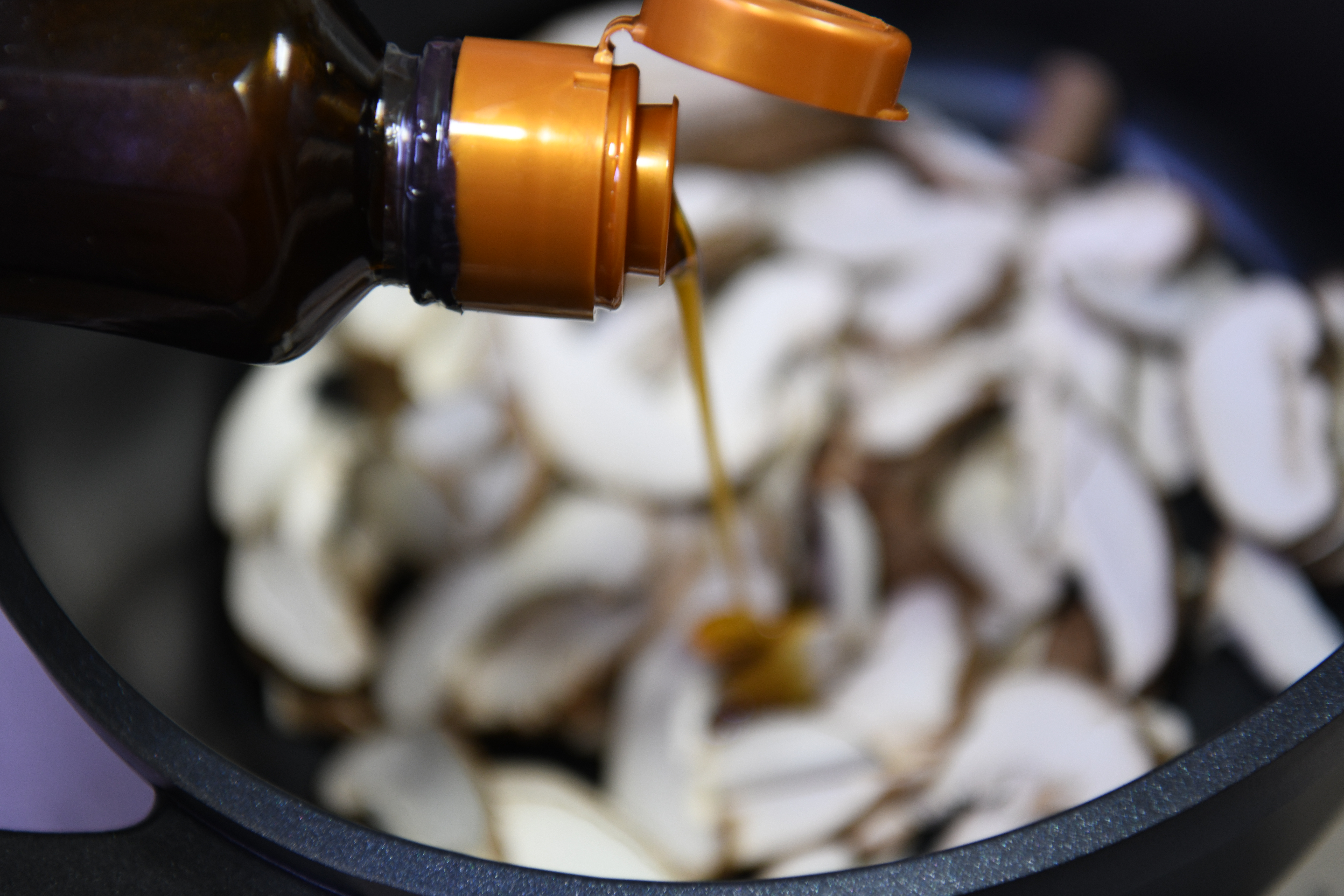 먼저 냄비에 참기름을 넉넉히 두른 후, 썰어둔 표고버섯을 볶아줍니다.