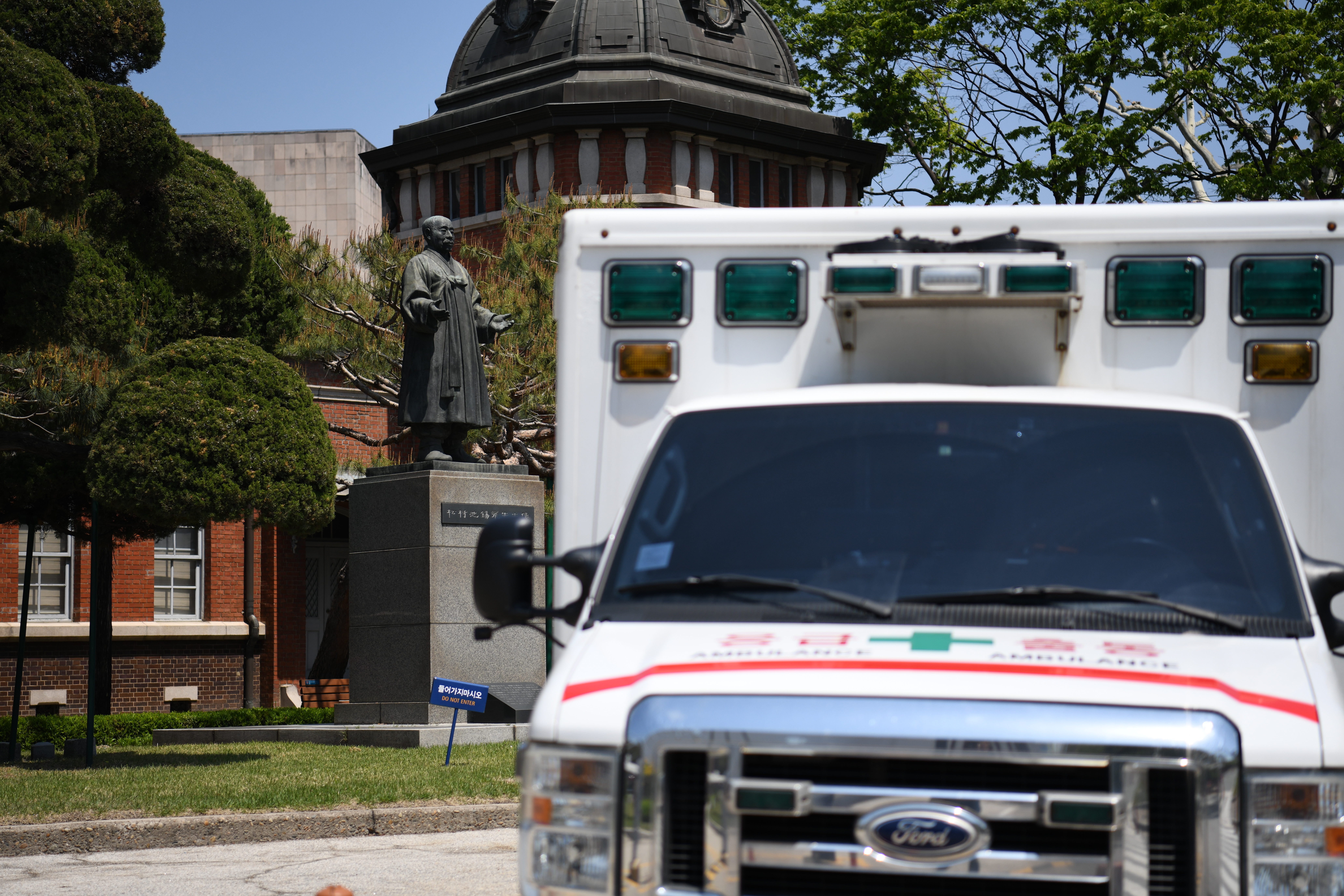 그 앞에 초 현대식 엠블런스가 서있는 모습이 대비적입니다.