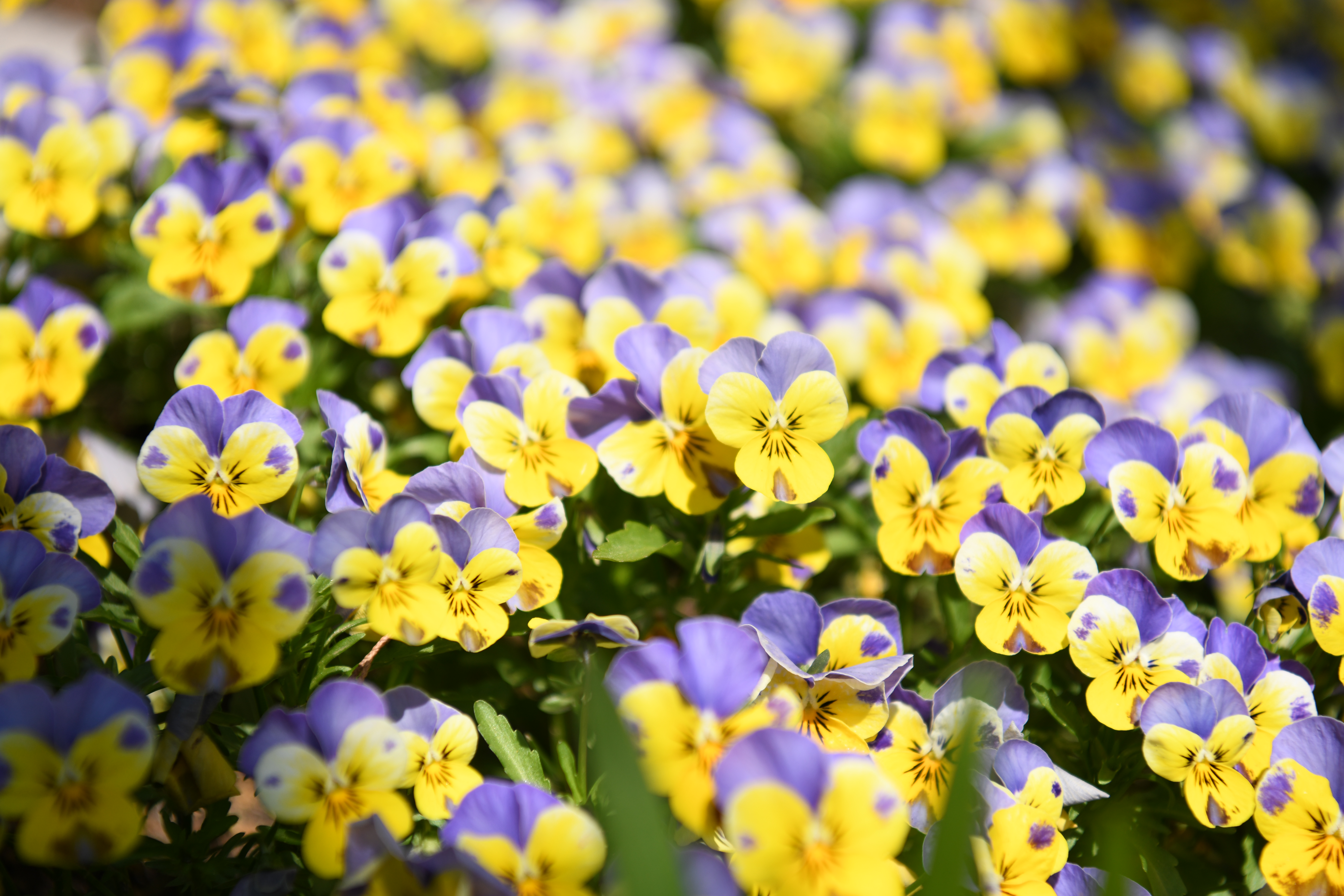화단 가득 피어난 보라색과 노란색 팬지는 봄의 에너지를 가득 머금은 듯 밝고 선명한 모습이었습니다.