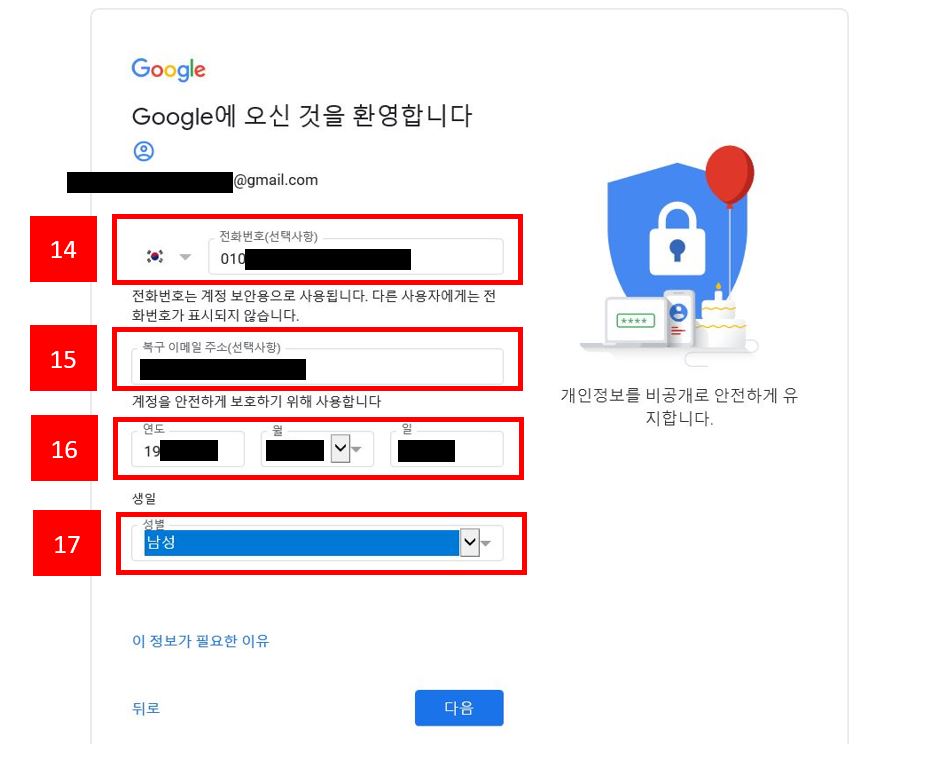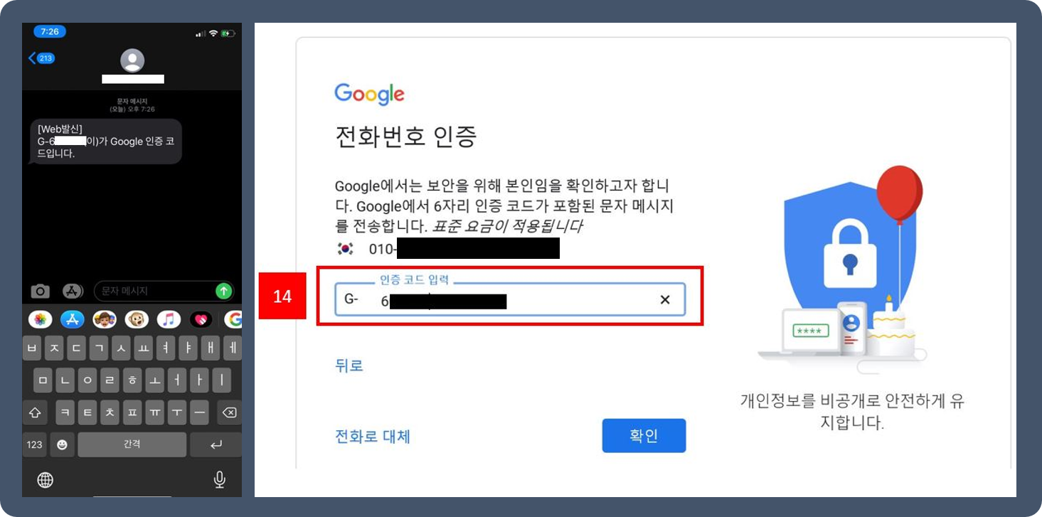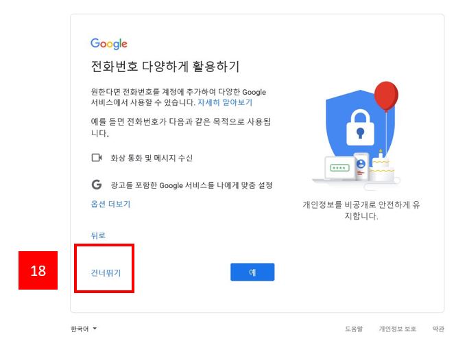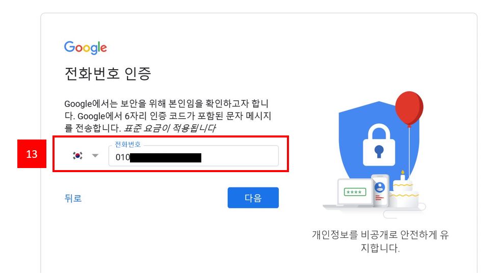 13. 구글의 강도높은 보안정책을 따르기 위하여 전화번호 인증을 받아야합니다.