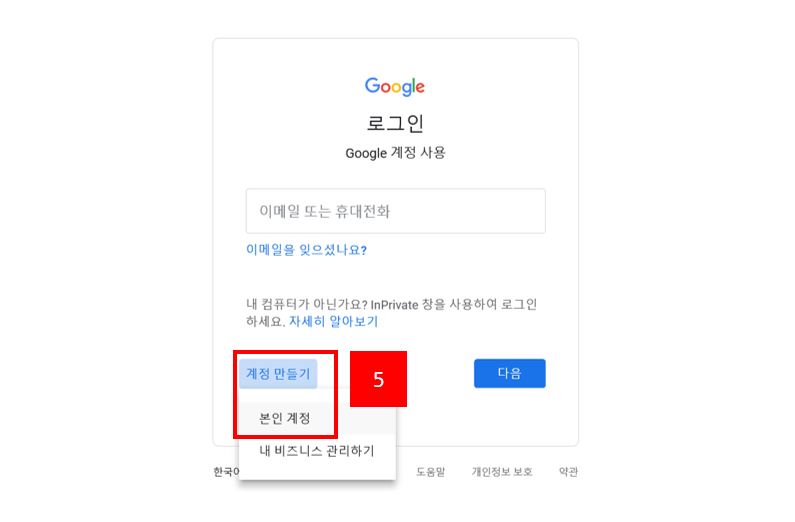 5. 계정만들기 버튼을 누른후, 하단에 생성되는 본인계정 만들기를 클릭합니다.