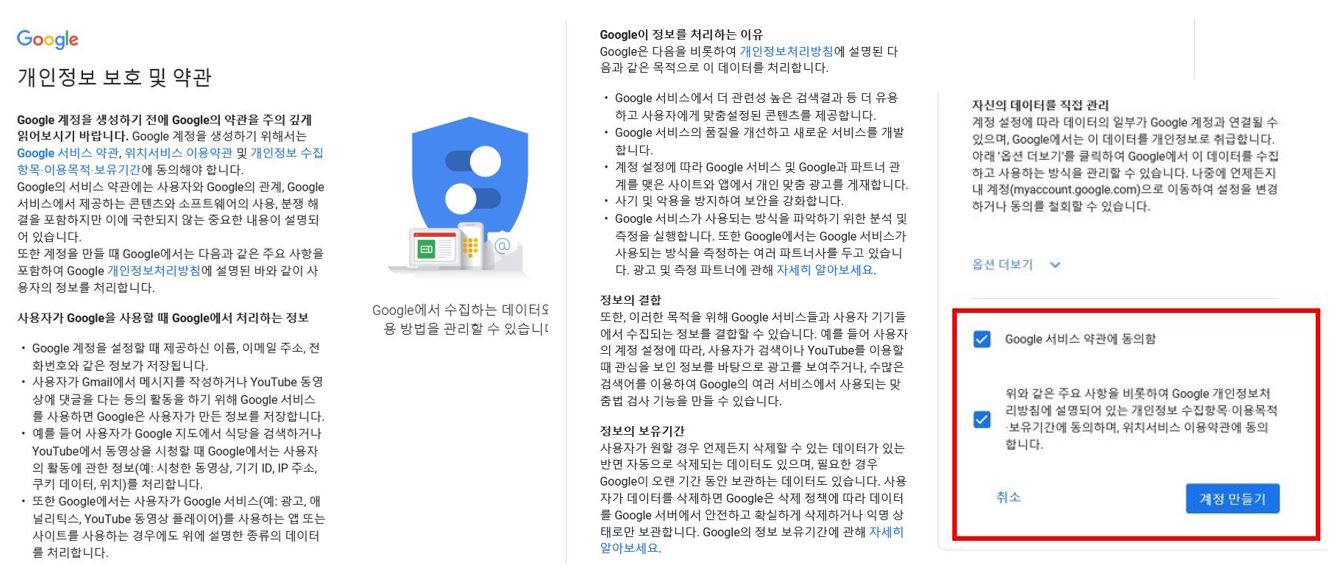 마지막으로 개인정보 보호 및 약관에 동의를 하고 계정만들기를 합니다.