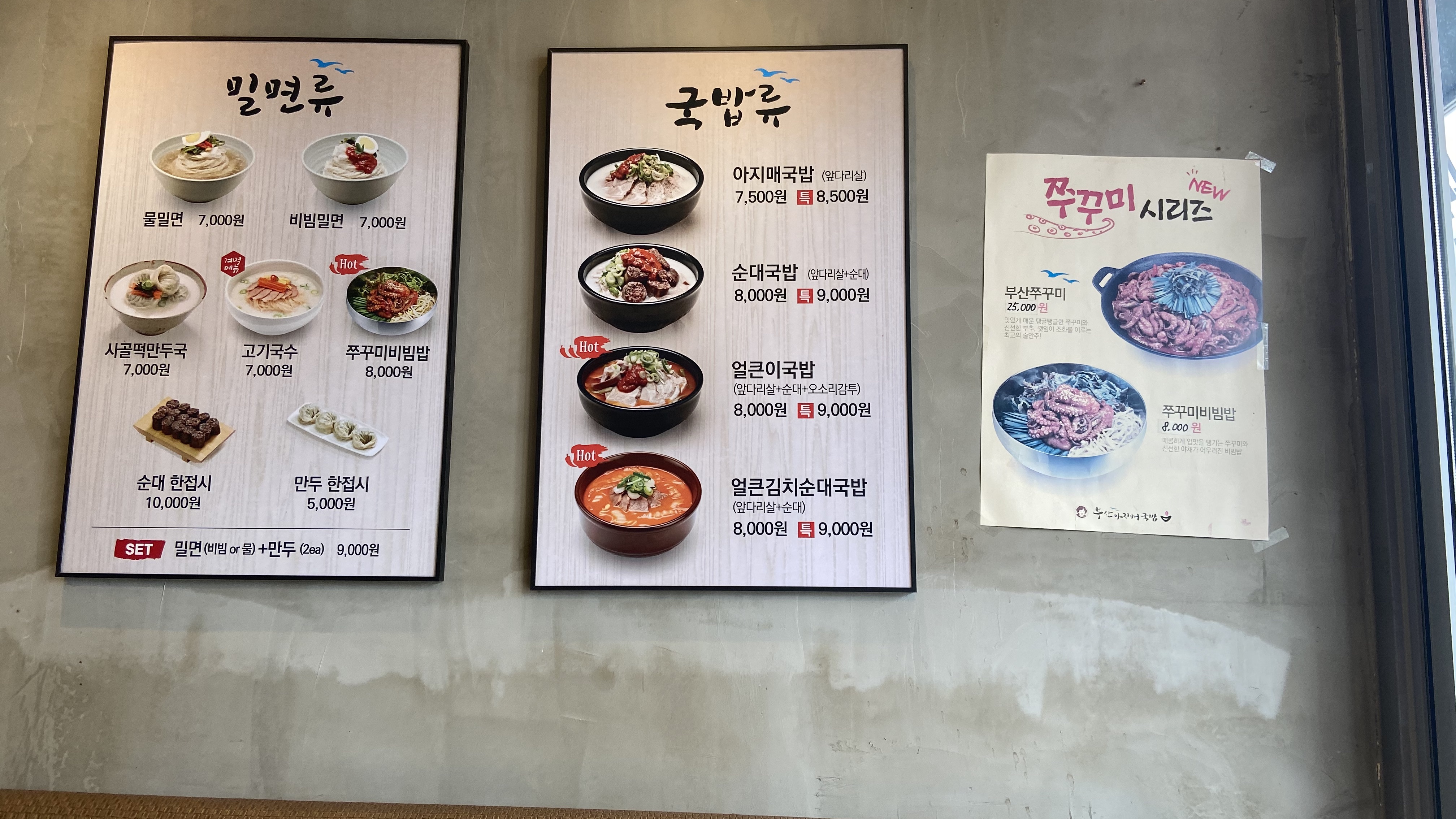 저는 음식에 관해서는 먹는것 만 먹는 소심한 성격인것 같습니다. 부산아지매국밥을 그렇게 많이 이용하면서도 늘 주문은 얼큰이 국밥입니다. 밀면류에 비빔냉면과 만두가 눈길을 끌긴 끕니다.
